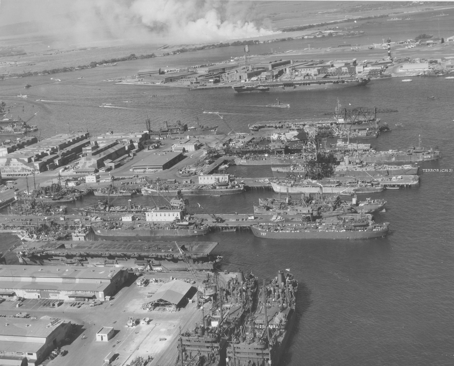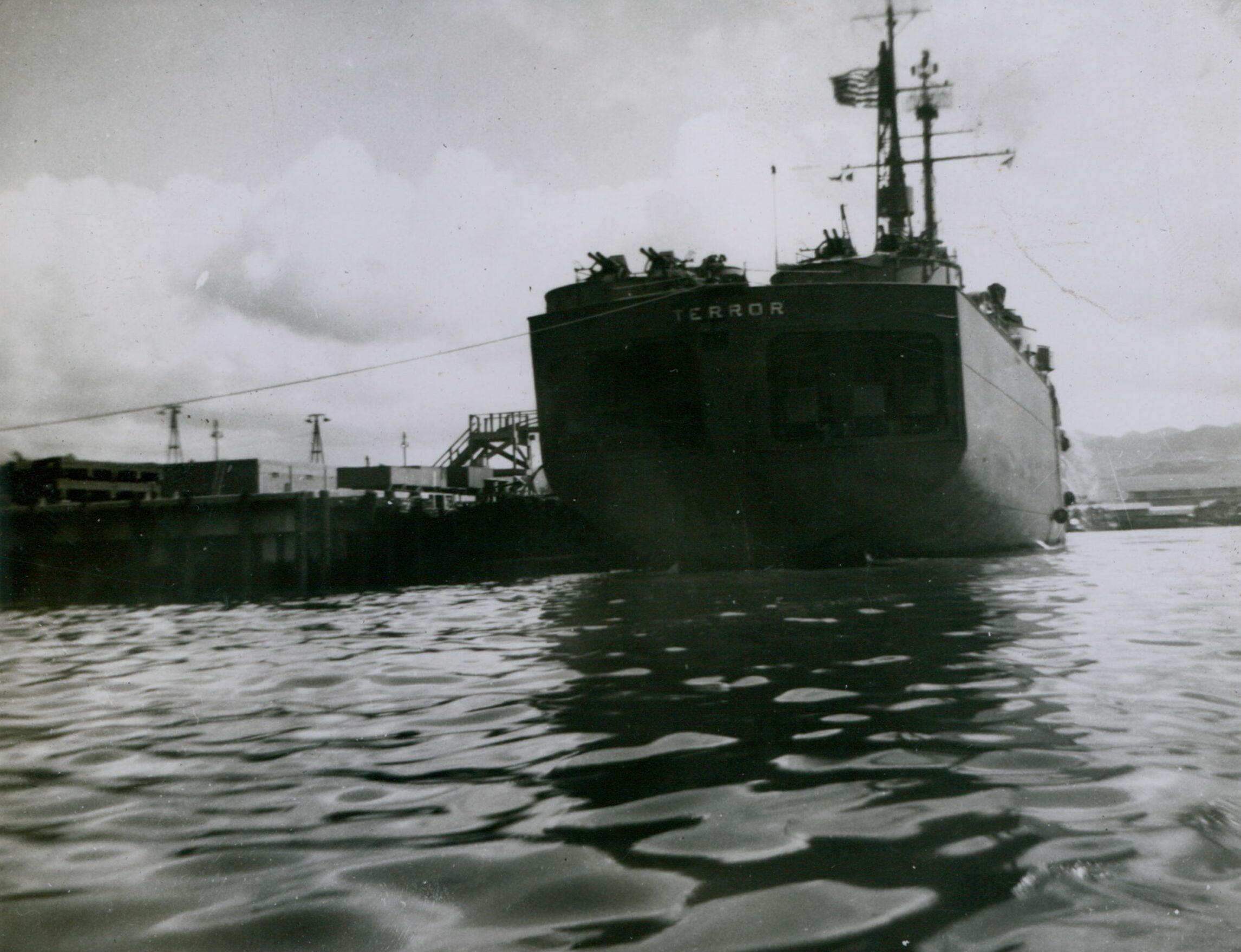 72k | Bow view of Terror at Pearl Harbor, probably early 1946. Original photo by MM2c Nathan Flaisher. | USS Terror website | |