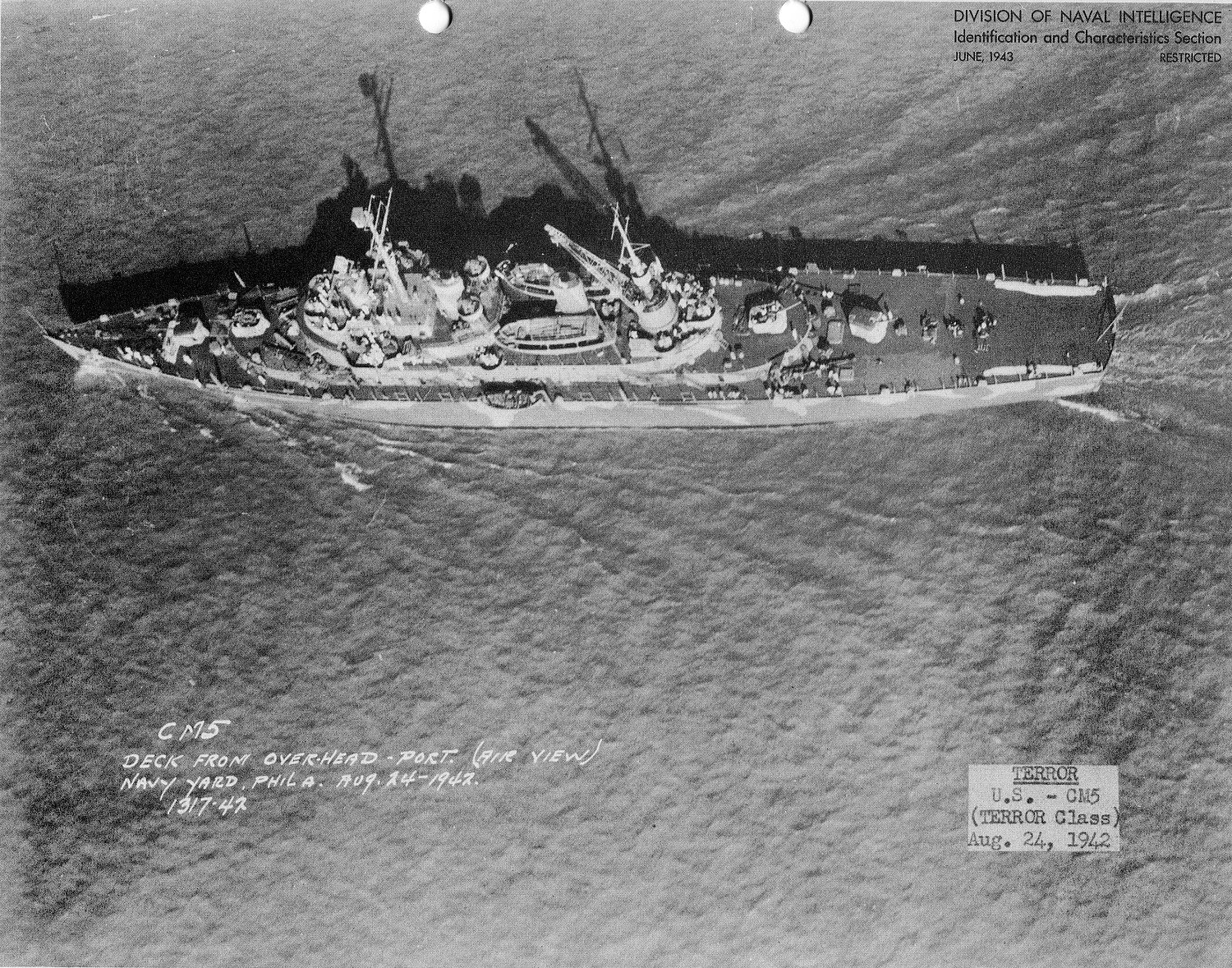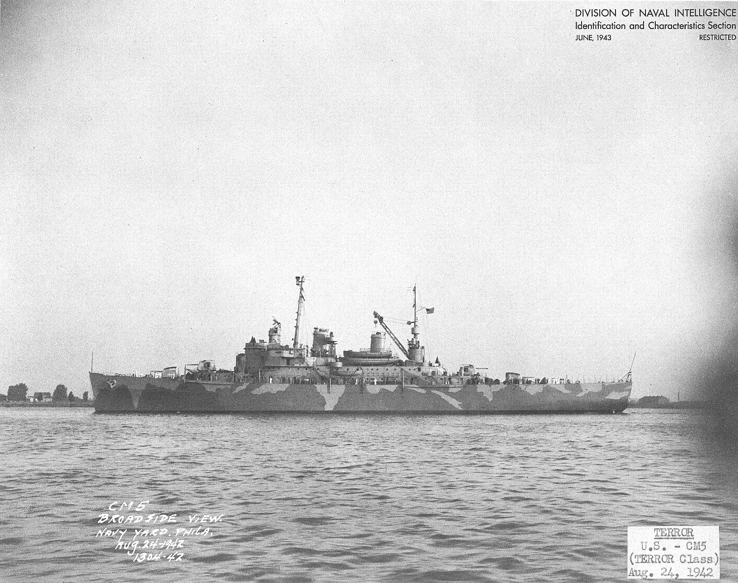 705k | Broadside view off the Philadelphia Navy Yard, 24 August 1942. Terror got underway at 0700 for a sea trial on the Delaware River, anchoring in Delaware Bay at 1806 for the evening. She then got underway at 0700 25 August for the return trip to the Navy Yard. U.S. Navy photo 1304-42 |