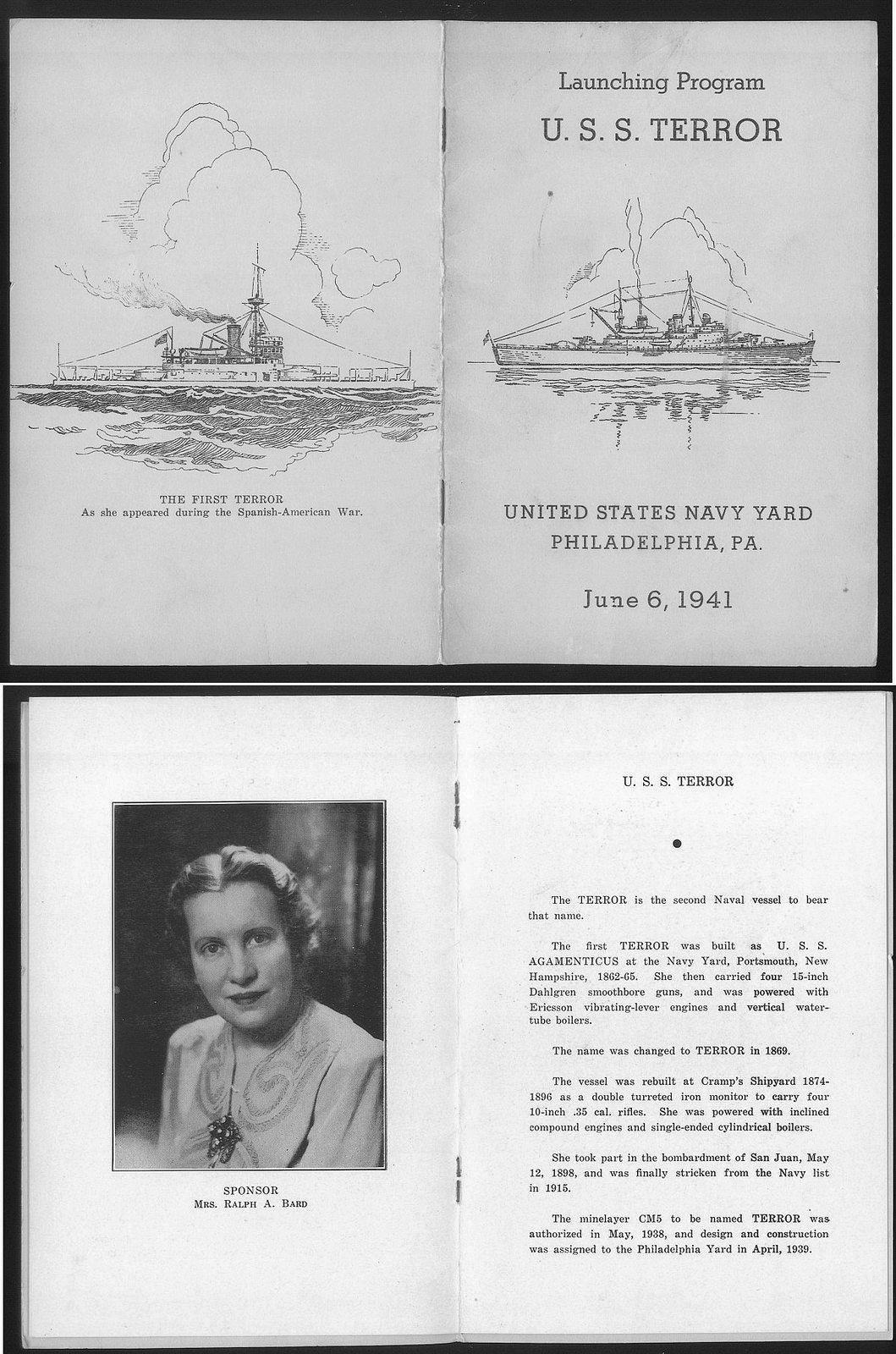 430k | 06 June 1941 Philadelphia, PA Vera S. Bushfield, wife of South Dakota governor Harlan J. Bushfield (left), who will christen the battleship USS South Dakota (BB-57) at the New York Shipbuilding Company, Camden, New Jersey on June 7, was on hand to get some pointers from Mrs. Ralph A. Bard (right), wife of the Assistant Secretary of the Navy, who christened the Terror, the first mine layer built for the Navy, at the launching ceremonies today at the Philadelphia Navy Yard. Photo by Acme Newspictures |