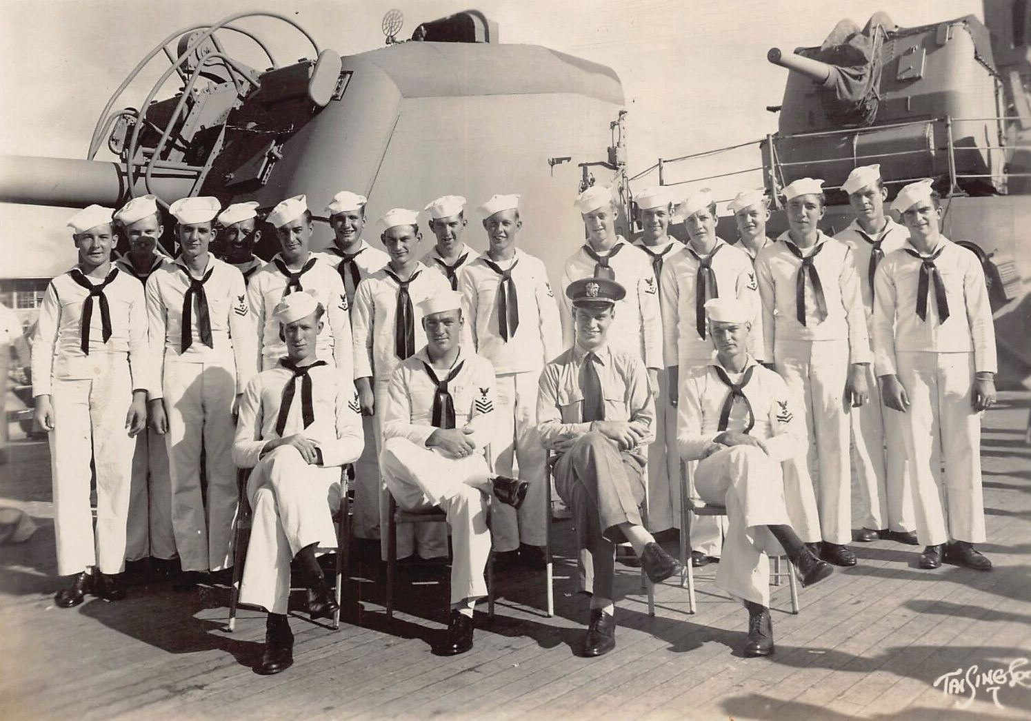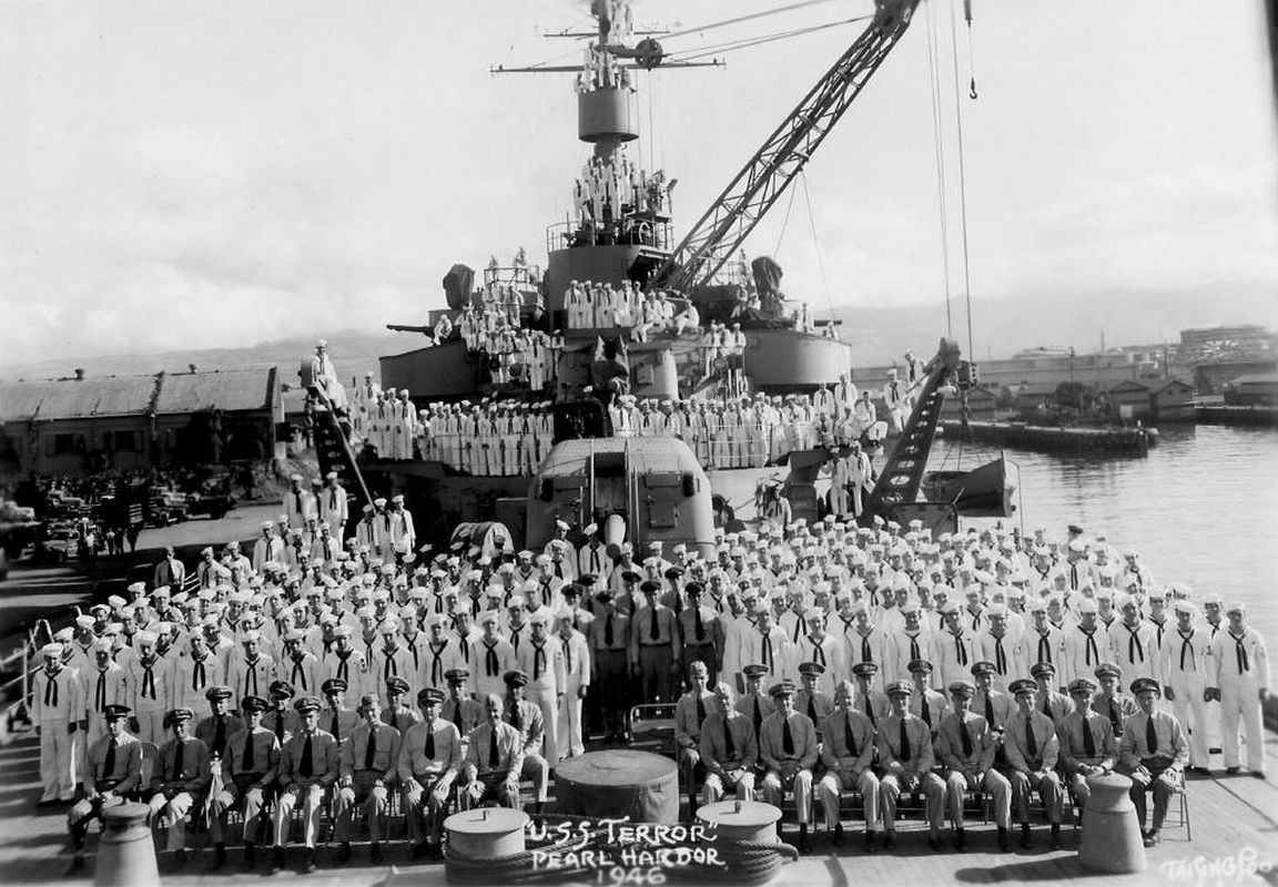 165k | Crew photo at Pearl Harbor, 14 February 1946. Original photo by Tai Sing Loo. | USS Terror website | |