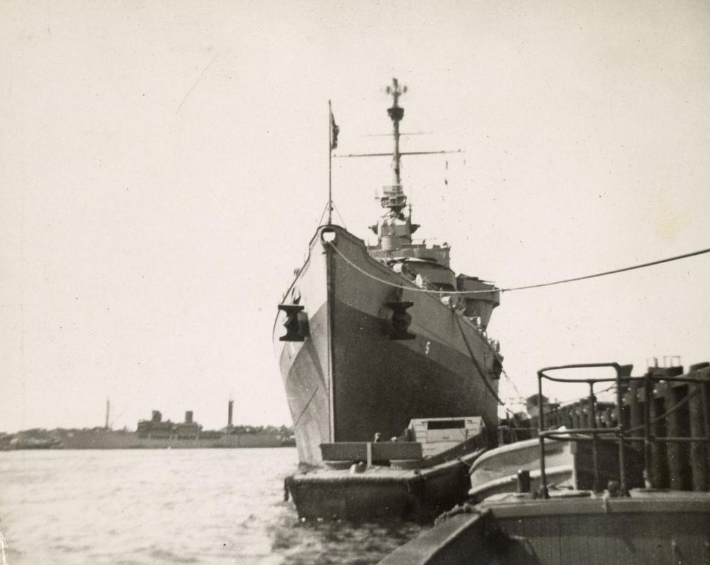 854k | As above, amidships view. Note the Mark 57 AA directors just abaft the second funnel, and the 40' and 50' motor launches nested amidships.