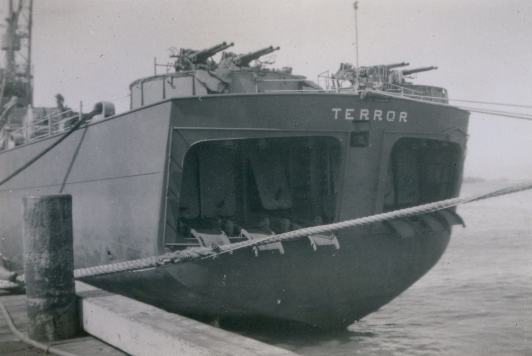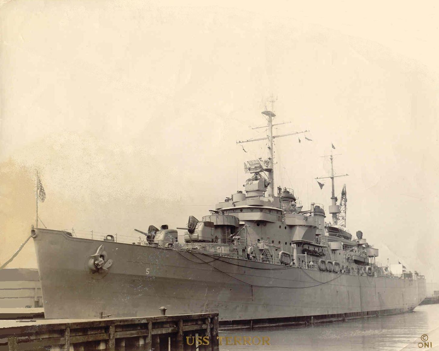 151k | Terror pierside, probably at Pearl Harbor, late 1945/early 1946. This shows her in her last configuration, with a twin 40mm mount forward of the bridge and quad 40s on the bridge sponsons. Photo provided by Frank Hillman. | USS Terror website | |