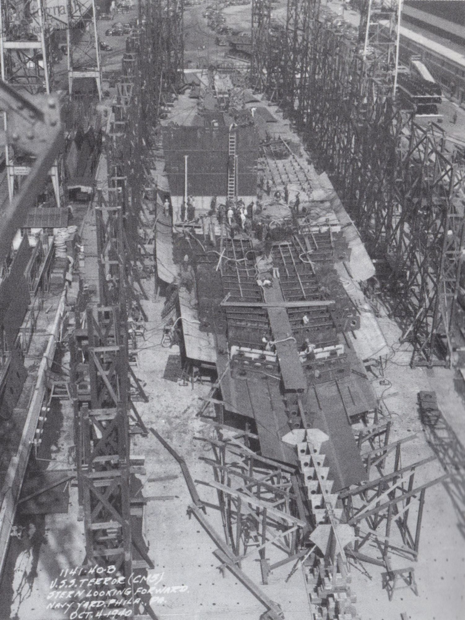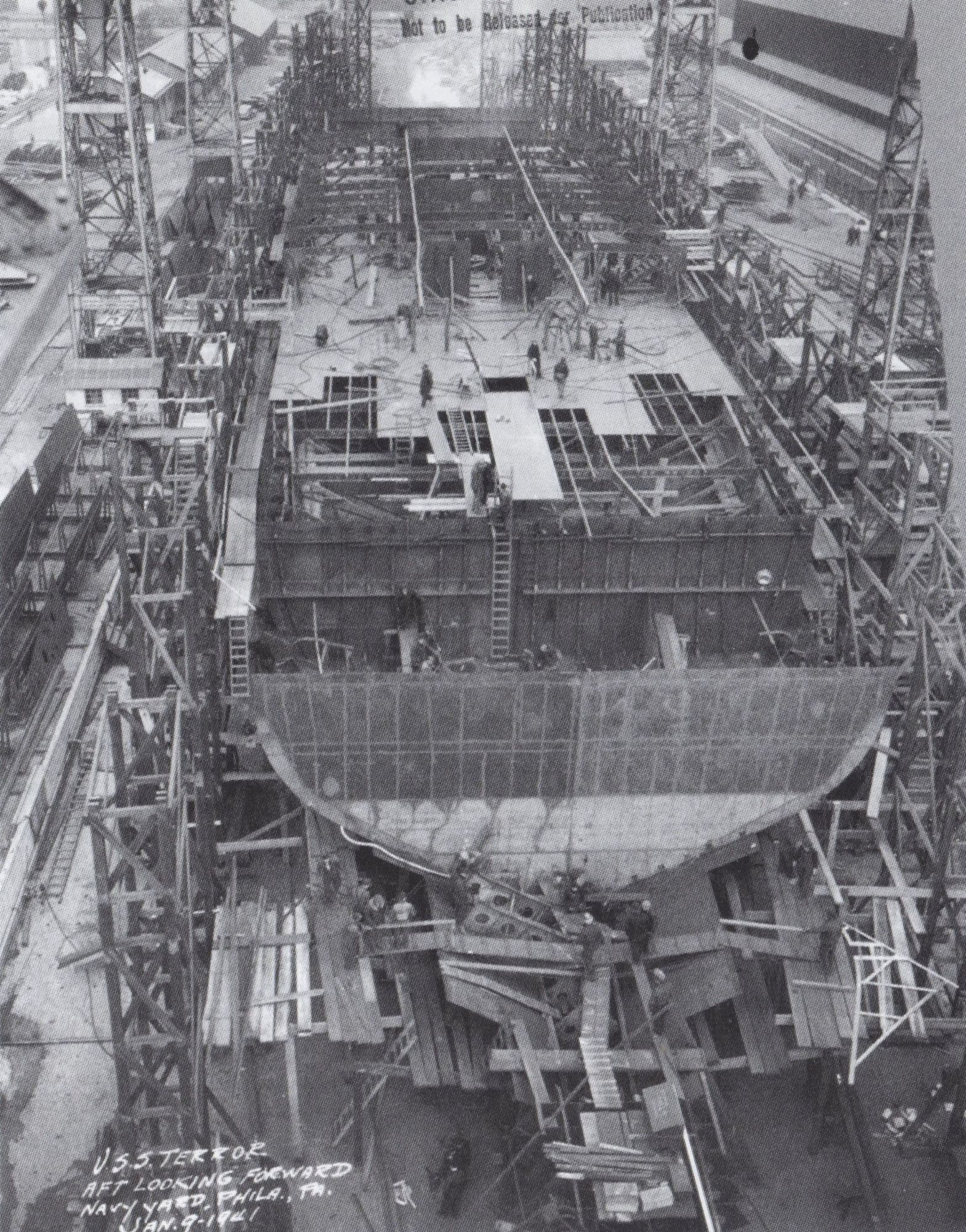 989k | Construction progressing on Terror, from stern looking forward, 09 January 1941. USN photo from National Archives RG 19-LCM file, College Park MD |