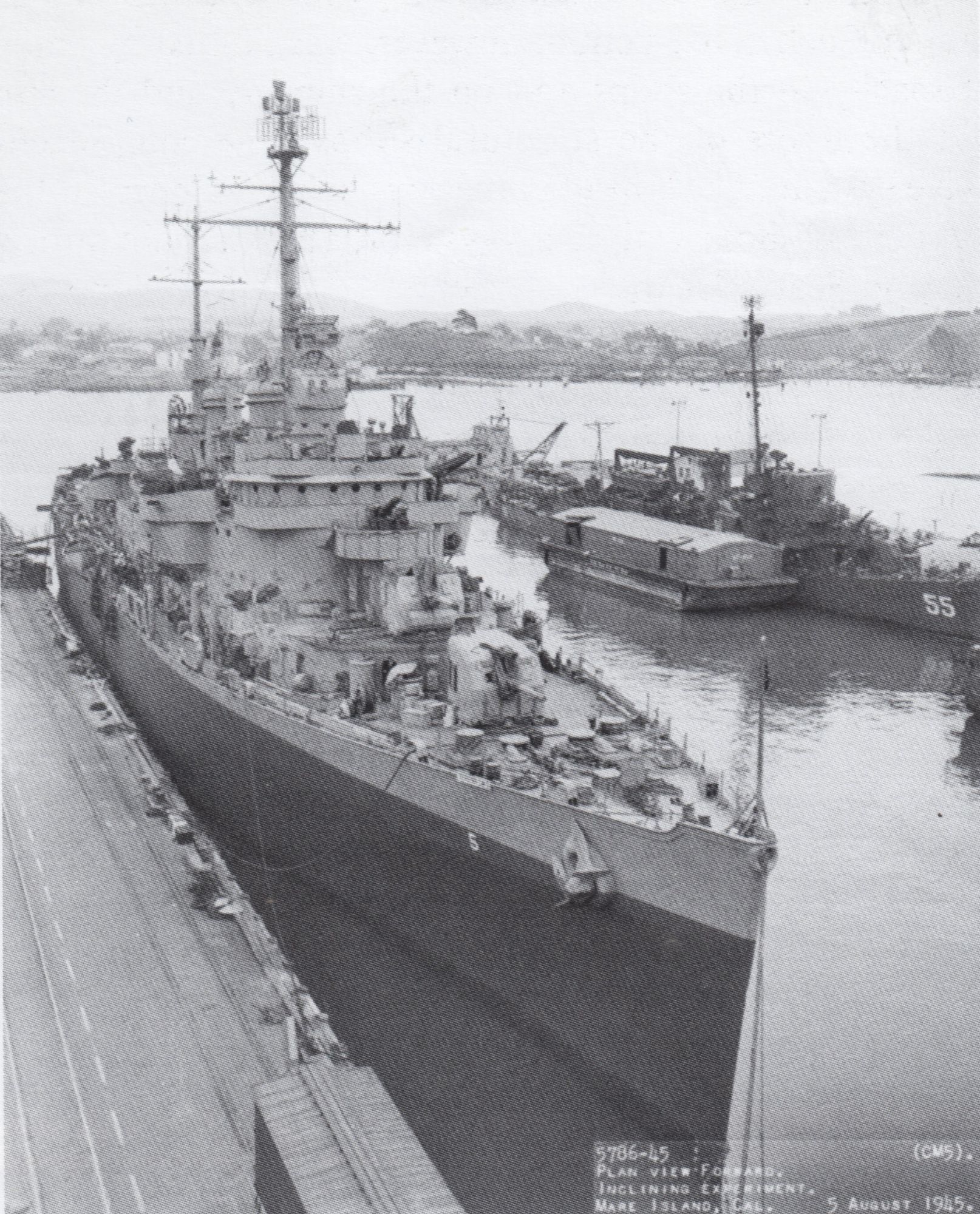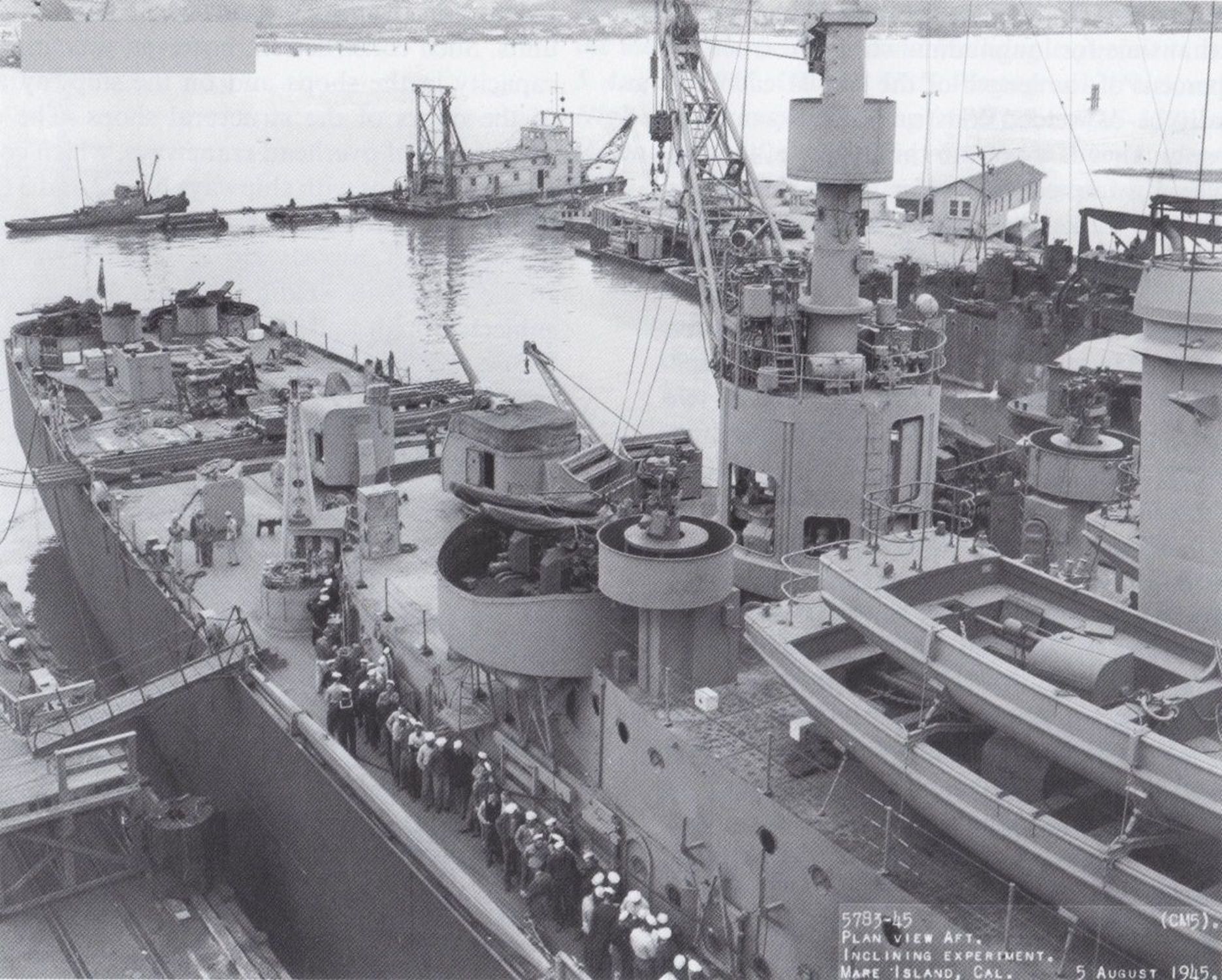 479k | As above, stern view. The tracks on the fantail by the aftermost 5"/38 mount are weights for the inclining experiment conducted that day. Motor tug YTL-87 is working with dredge YM-12 in the background.