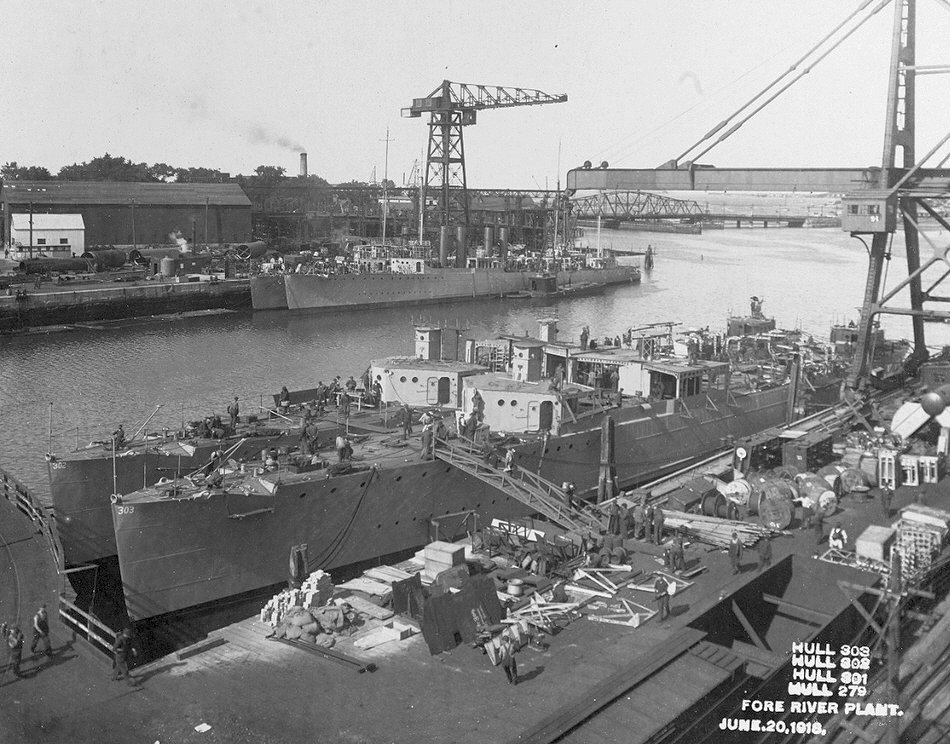 178k | Four Wickes class destroyer destroyers fitting out at Fore River on 20 June 1918, with USS Murray (DD-97, hull number 303) nearest to the camera and USS Stribling (DD-96, hull number 302) next in line. In the background is USS Bell (DD-95, hull number 301) and behind that USS Dyer (DD-84, hull number 279) | History of War | |