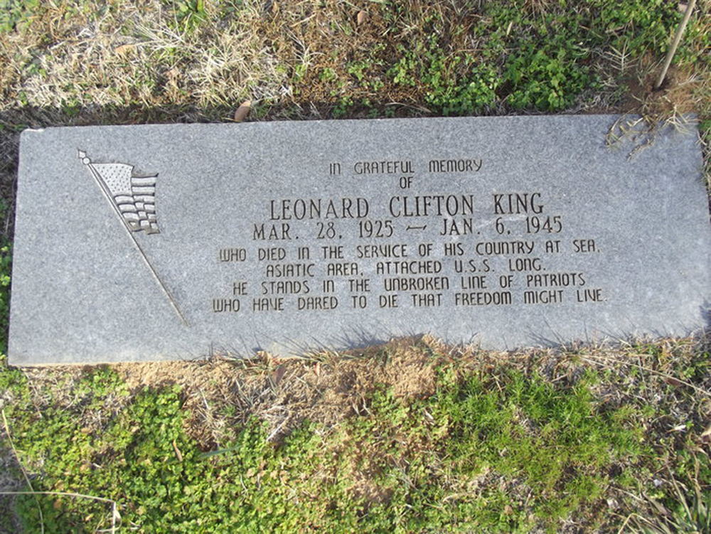 785k | Leonard Clifton King. WHO DIED IN THE SERVICE OF HIS COUNTRY AT SEA. ASIATIC AREA, ATTACHED USS LONG. HE STANDS IN THE UNBROKEN LINE OF PATRIOTS. WHO HAVE DARED TO DIE THAT FREEDOM MIGHT LIVE. In Memorium: In the Second Book of Shmuel (Samuel), 22nd chapter, 5th through the 20th verses, translated from the original in Hebrew and published by the Koren Publishers of Jerusalem, Israel, 1982, can perhaps aptly describe the fate of the crew and all other U.S. sailors who died defending their county: "When the waves of death compassed me / the floods of ungodly men made me afraid; / the bonds of She'ol encircled me; / the snares of death took me by surprise; / in my distress I called upon the Lord, / and cried to my G-D: / and he heard my voice out of his temple, / and my cry entered into his ears. / Then the earth shook and trembled; /the foundations of heaven moved / and shook because of his anger /...the heavy mass of waters, and thick clouds of the skies /... And the channels of the sea appeared, / the foundations of the world were laid bare, / at the rebuking of the Lord, at the blast at the breath of his nostrils. / He sent from above, he took me; / he drew me out of many waters; / he delivered me from my strong enemy, and from those who hated me; for they were too strong for me. / They surprised me in the day of my calamity: / but the Lord was my stay..." | Image provided by findagrave.com | |