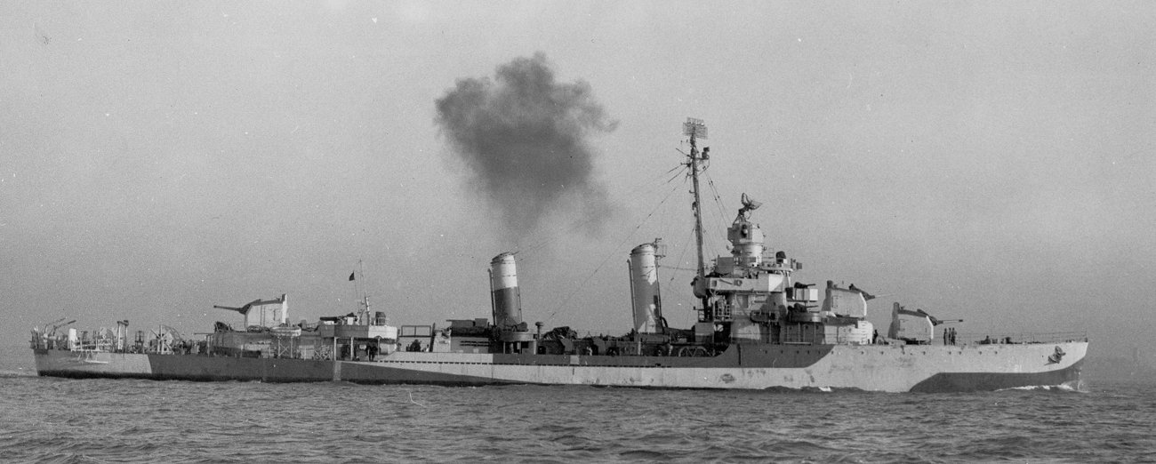 139k | Photographed by Ted Stone while moored to a buoy, circa 1950 Courtesy of the Mariners Museum, Newport News, Virginia. Ted Stone Collection Naval History and Heritage Command photo NH 66816 |