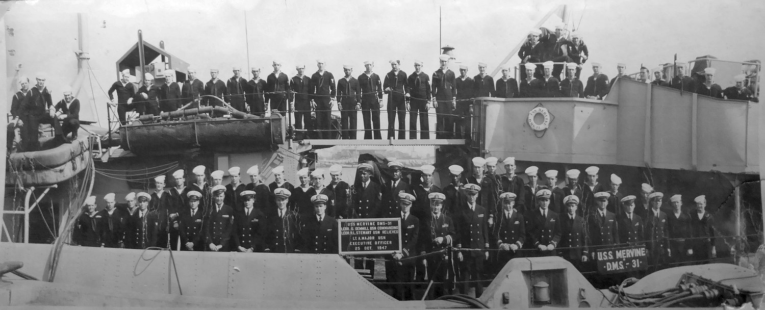 25 October 1947 Terminal Island Naval Shipyard, Long Beach, CA Crew photo after change of command Mervine was undergoing repairs caused by accidental removal of a portion of a 14” sea valve, which flooded the entire boiler room and nearly caused the sinking of the ship. This was while it was moored alongside a tender in the middle of San Diego Harbor Photo from the collection of ENS Robert B. Rausch, USNR |