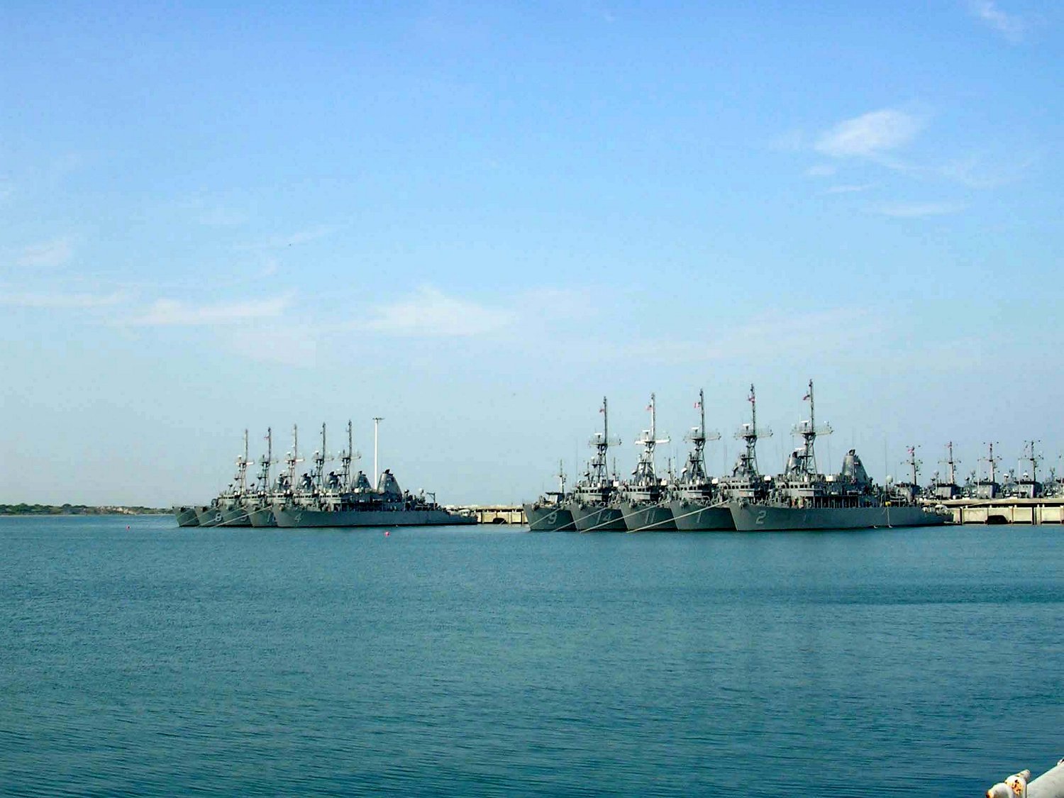 221k | 23 September 2005 Ingleside, TX In preparation of Hurricane Rita, mine countermeasures ships home ported at Naval Station Ingleside nest in a modified mooring. Ships present (left to right): Unknown, Scout (MCM 8), unknown, Sentry (MCM 3), Champion (MCM 4), Pioneer (MCM 9), Chief, Gladiator (MCM 11), Avenger (MCM 1) and Defender (MCM 2) U.S. Navy photo 050923-N-4913K-006 by Fifi Kieschnick |
