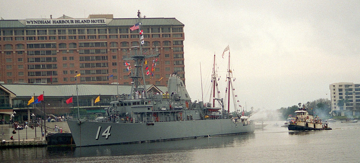 277k | 27 January 1995 Tampa, FL Under "attack" by the S.S. Ybor (actually the tugboat Janet K.) as the mock pirate invasion of Tampa by the Ybor Navy begins as part of the annual Gasparilla celebration Department of Defense photo DN-SC-95-01357 by OS2 John Bouvia |