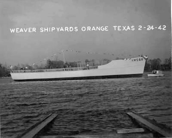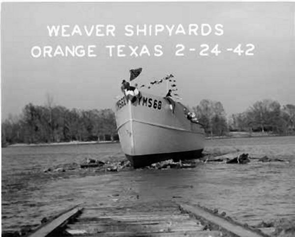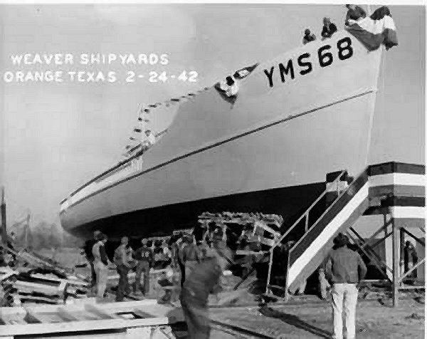 Orange, Texas, Feb 24: Almost with the setting of the February sun, the "YMS-68" United States Minesweeper took her initial plunge in to the waters of (the) Sabine river on the ways at the Weaver shipyards at 5:55 pm Tuesday. Although almost an everyday affair at Orange the beautiful launching furnished a thrill for a large group of friends, who shivered as the vessel, bedecked with scores of flags of allied nations, started on its journey which will ultimately include the task of sweeping the waters of the sea ahead of great war vessels.