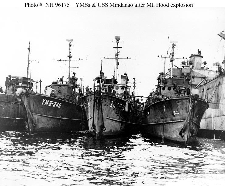Four motor minesweepers (YMS) alongside the starboard side of USS Mindanao (ARG-3) shortly after Mount Hood [AE 11] blew up about 350 yards away from Mindanao's port side. These wooden minesweepers were protected from most of the direct force of the blast by Mindanao's hull, but received some damage. USS YMS-340 is second from the left. Note that her open bridge bulwarks have been blown down. Also note differing types of retracting accoustic "hammer box" mountings on the bows of these ships. Copied from the War Diary, Manus Naval Base, November 1944. U S Navy Photo NH 96175. |