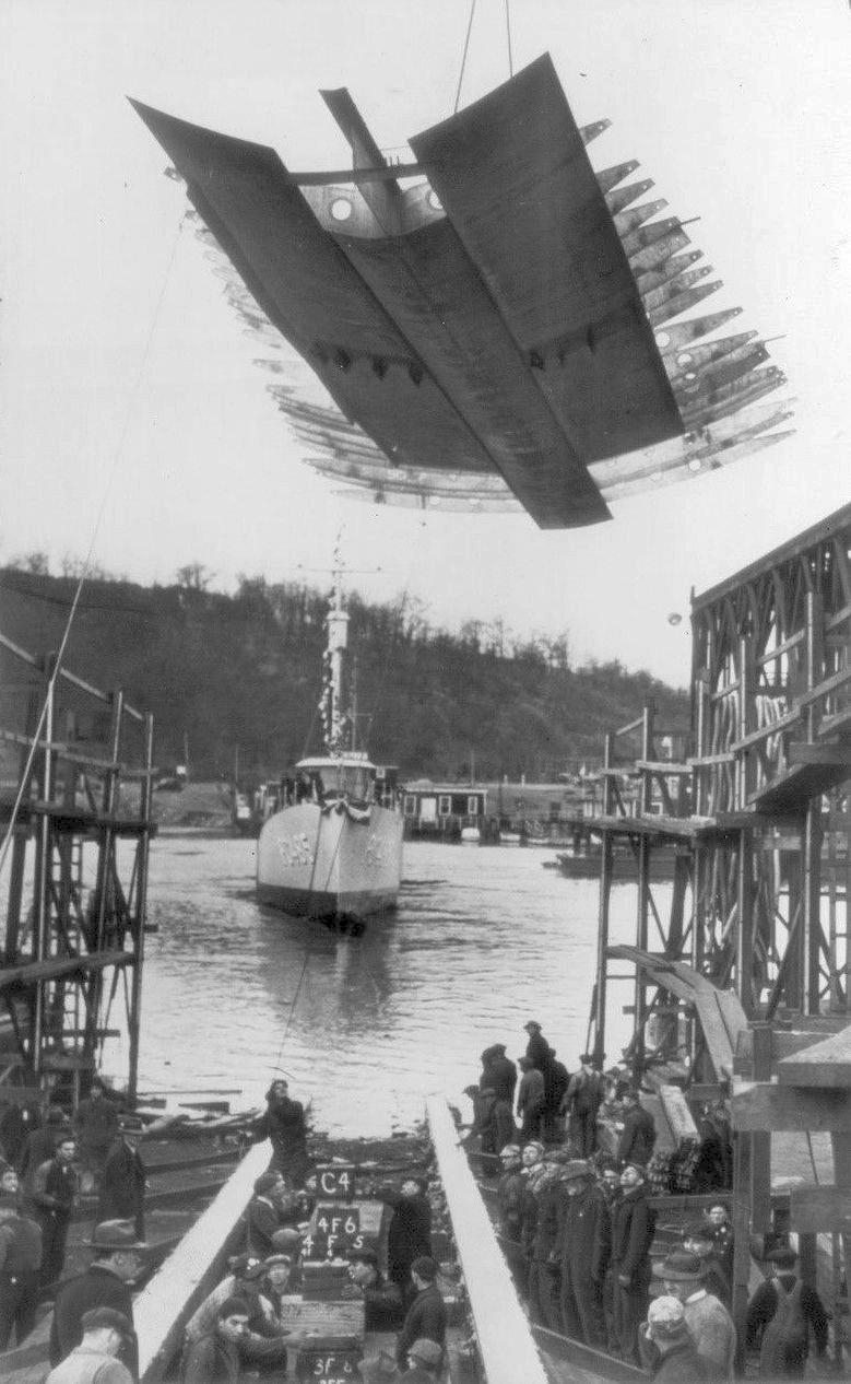 153k | 20 December 1941 New York ONE SUBCHASER FOLLOWS ANOTHER--As the submarine chaser PC485 slipped into the Harlem River today, the keel for another one, the PC563, was lowered into place at the Consolidated Shipbuilding Corp. yards. The Navy is building the sub-chasers at a cost of about $1,000,000 each to intensify its drive against enemy U-boats. (APWIREPHOTO)(SEE WIRE STORY)(L71330jr) |