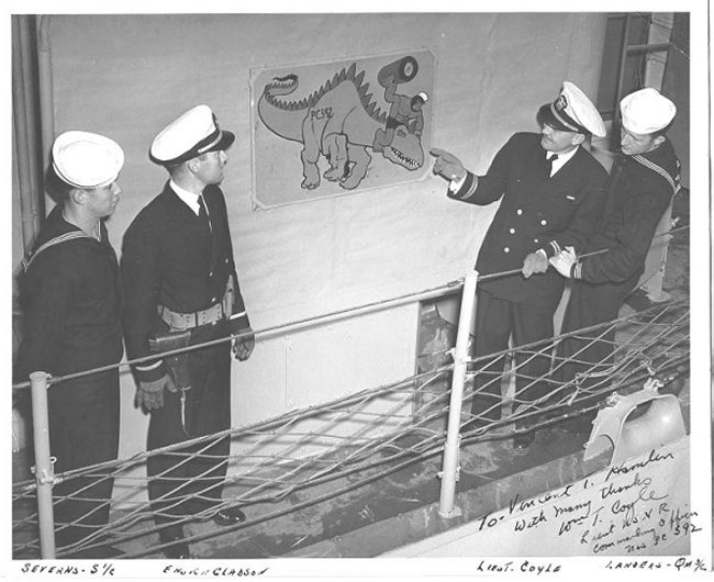 The Commanding Officer, LT W. T. Coyle, ENS Gladson, QM3/c Landers, and S1/c Severns admire the art work of V. T. Hamlin, creator of the comic strip "Alley Oop." Photo from the Vincent T. Hamlin Archives. |