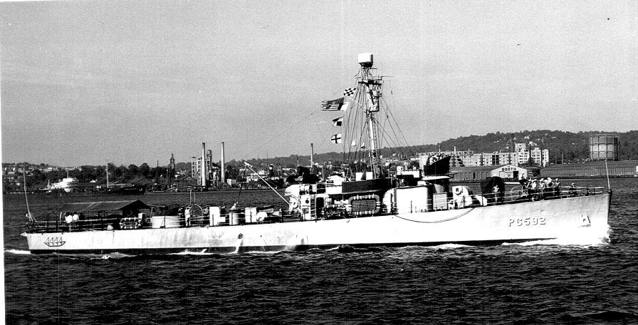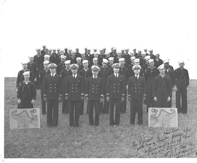 PC-592 crew photo. From left to right: First row: Chevlier S2/c, ENS Hyde, LT Hess, LT Coyle (Commanding Officer), LTJG Ross, ENS Gladson, Severns S1/c. Second row: Chiaro S2/c, Goff SoM3/c, Anderson SM2/c, Landers QM3/c, Morrison-Coxswain, Bosco S2/c, Eckberg MoMM2/c, Hinds S2/c, Johnson Matt3/c, Crane S2/c. Third row: McClaren SF2/c, Brooks EM2/c, Granville MoMM2/c, Allen PhM1/c, Nichols SK3/c, Burford EM2/c, Pitt GM3/c. Fourth row: Lyman QM3/c, McRae GM2/c, Collier S2/c, Blodgett SC2/c, Conloy SC2/c, Marrula F3/c, Weisgerber S2/c, Odell MM1/c, Cronk MM1/c, Cohen S2/c, Caverlee Y3/c. Fifth row: McFerrin SoM2/c, Grillo S2/c, Polin S2/c, Putnam SM3/c, Hawk S2/c, Luevans SM3/c, Cross MM2/c, Cole F3/c, Tierney S2/c. Sixth row: Beth S2/c, Davis Matt2/c, Dietz-Coxswain, Digby BM2/c, Greene F1/c, Shepherd MM2/c, Dokin MM2/c, Gross S2/c, Welter SoM3/c, Haynes F1/c. Photo from the Vincent T. Hamlin Archives. |