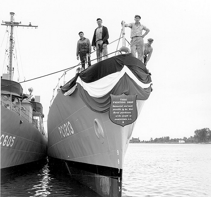 87k | PC-605 with PC-1213 after the latter's launching, 22 May 1943. Inscription on plaque reads: "This Fighting Ship Sponsored and Made Possible by the War Bond Purchases of the People of Jamestown, NY" National Archive Photo 19-N-47911 |