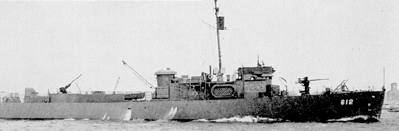Specifications:Displacement 450 t.Length 173' 8"Beam 23'Draft 10' 10"Speed 20.2 kts.Complement 65Armament: One 3"/50 dual purpose gun mount, one 40mm gun mount, five 20mm guns, two rocket launchers, and two depth charge tracksPropulsion: Two 1,440bhp Hooven-Owen-Rentschler R-99DA diesel engines (Serial No. 6837 and 6838), Westinghouse single reduction gear, two shafts.