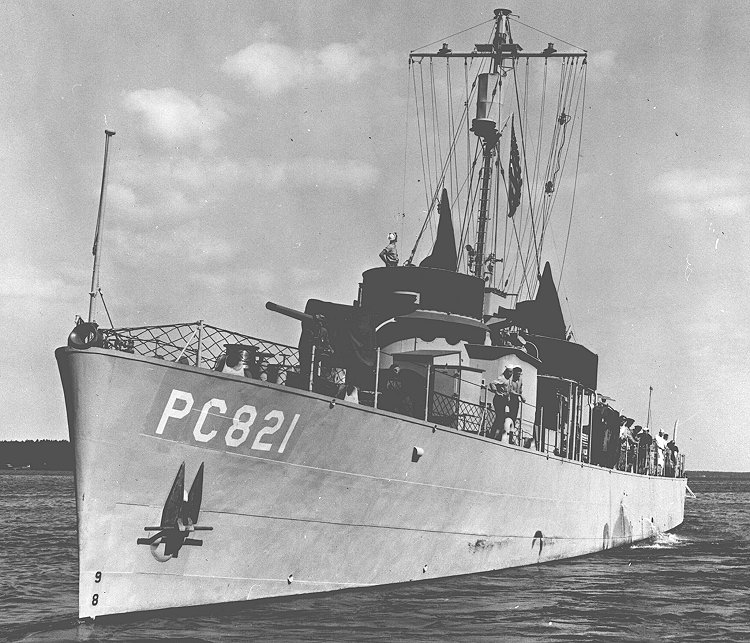 PC-461 Class Submarine Chaser:Laid down 1 September 1943 by the Leathem D. Smith Shipbuilding Corp., Sturgeon Bay, WILaunched 23 October 1943Commissioned 23 June 1944Transferred to the War Shipping Administration in June 1948Sold 7 June 1948 and presumed scrapped.