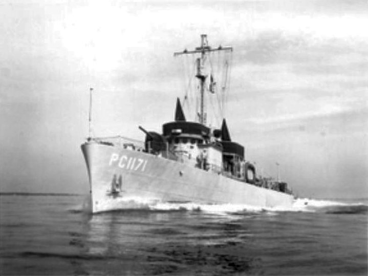The PC-1171 was built by the Leathem D. Smith Shipbuilding Company of Sturgeon Bay, Wisconsin. Contract awarded during FY 1942 (27 October 1942). Her keel was laid down on 12 March 1943, launched on 15 May 1943. Her sponsor was Miss Betty Lau. The builders trials were completed on 2 September 1943 and she was commissioned at the NOB New Orleans, LA on 24 September 1943. After her shake down cruise and SCTC training, she reported for duty as school ship at SCTC Miami in November of 1943. On 9 June 1945, after 20 months of service as a SCTC school ship she was ordered to report to CinCPac for duty. In early July 1945, she entered the Dade Dry Dock Shipyard for Pacific duty modifications. The "K" guns were removed and three more 20 mm units were installed for a total of five and the below deck ventilation was increased. Departing Miami on 21 July 1945, she arrived in the Canal Zone on the 26 July 1945 where they reported to CinCPac for duty. They were ordered to Pearl Harbor via San Diego. The Atom bombs were dropped and the cease fire was ordered while they were steaming between San Diego and Pearl Harbor.
