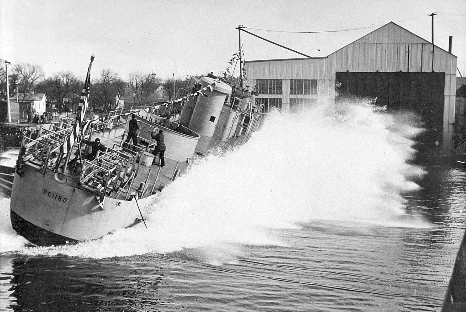 15 January 1944 Alongside the fitting out dock at Sturgeon Bay, WI with unfinished PC-822 in background Great Lakes Institute photo |