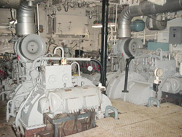 Engineroom view showing the gearboxes in front of the two rear main engines |