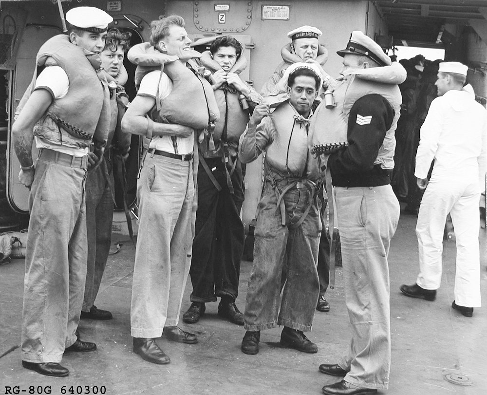 11 May 1954 Crewman aboard Wolf underway with Fleet Training Group, Chesapeake Bay, Norfolk, VA., don life jackets during collision drill. National Archives photo 80-G-640300 |