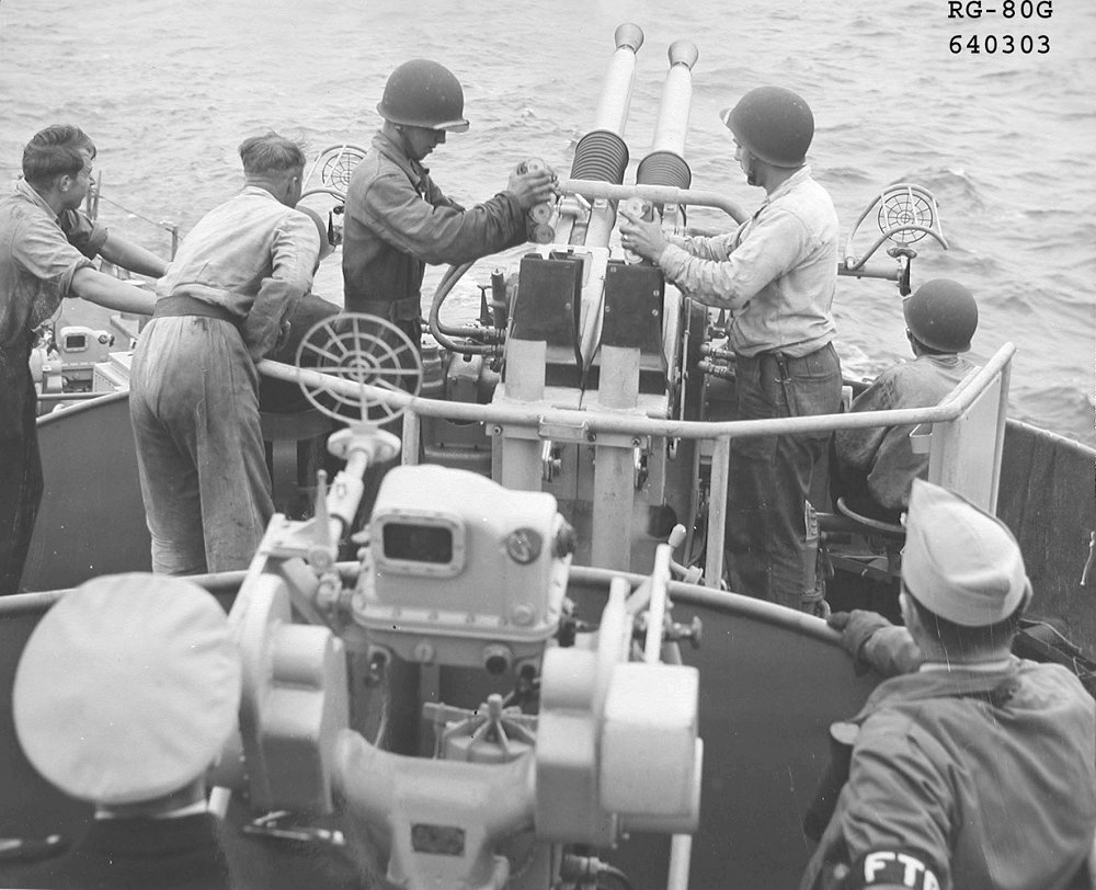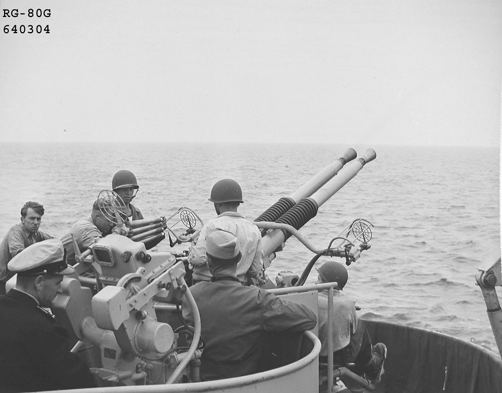 11 May 1954 Gun crew goes into action as C. E. Shealy, GMC, USN, Shipboard Instructor and LCDR J. R. Riediger, USN, Liaison Officer (top center) stand by. National Archives photo 80-G-640302 |