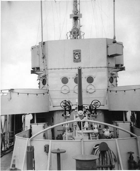 21. Main deck, looking aft at 3"/50 mount and bridge