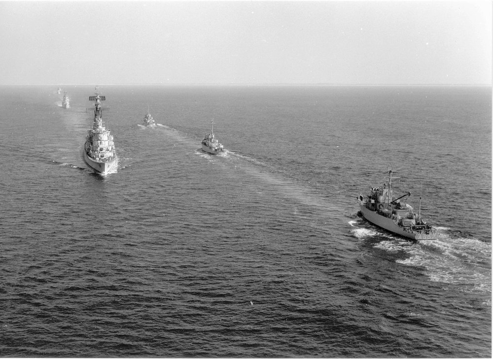 Vos, Panter and Onvermoeid (A 857), ex-MSO-484 passing the light cruiser de Ruyter (C 801) to port. |