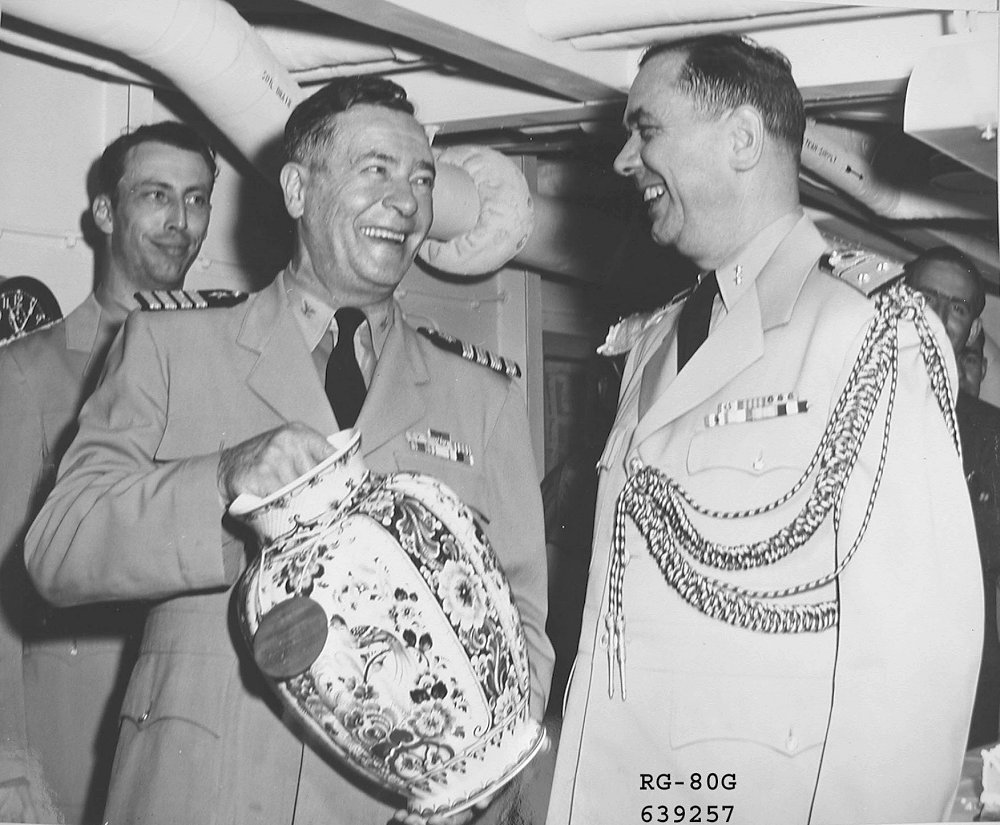 11 June 1954 Transfer of PCE-1608 and PCE-1609 to Netherlands Navy at Naval Station New Orleans, LA. Capt. F. H. Gardner, USN, C.O. (left), accepts a vase, on behalf of the station, presented him by RADM Gerard Koudijis, RNN as a token of appreciation and friendship extended officers and men of the ships which were transferred National Archives photo 80-G-639257 |