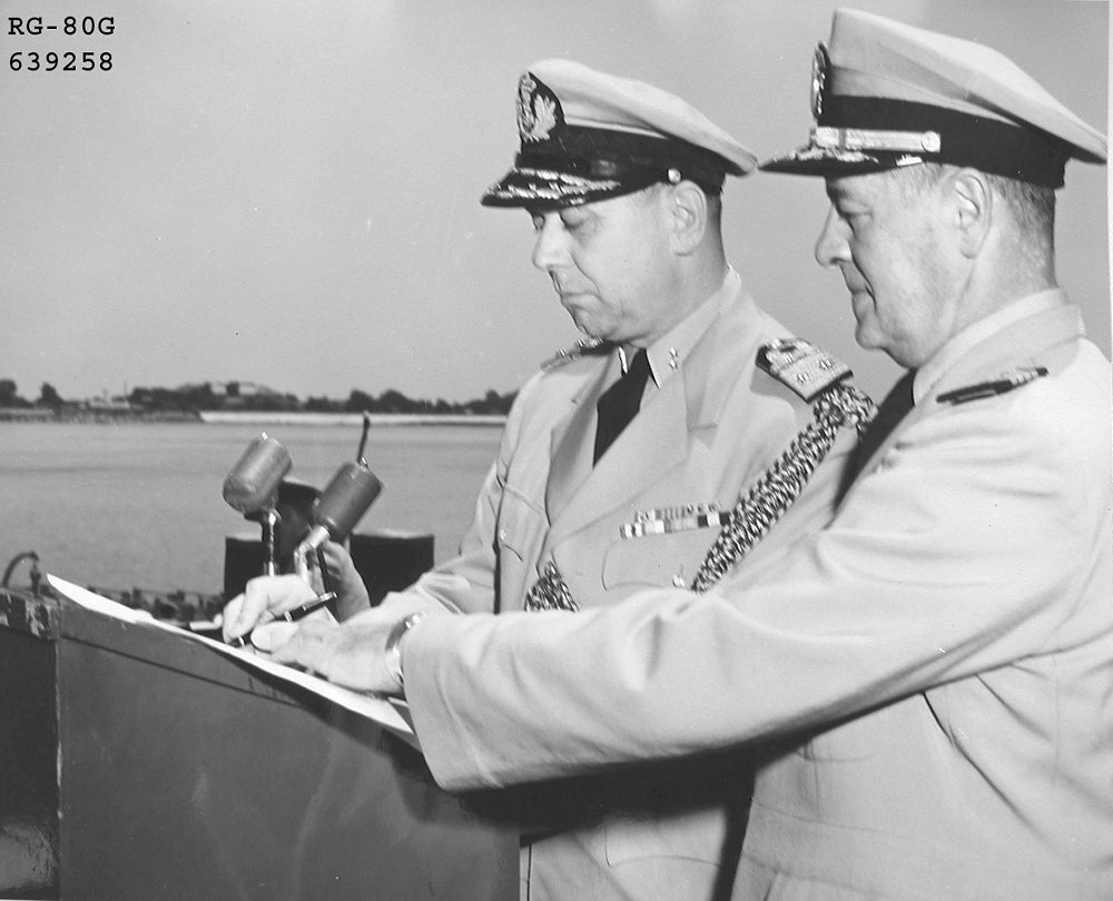 11 June 1954 Transfer of PCE-1608 and PCE-1609 to Netherlands Navy at Naval Station New Orleans, LA. RADM Gerard Koudijis, RNN signs the papers as Capt. F. H. Gardner, USN, looks on National Archives photo 80-G-639258 |