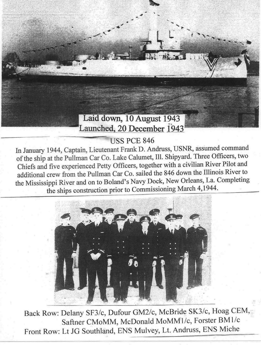 The eleven U.S. Navy personnel, Captain and Crew [plus civilian river pilot and shipyard personnel, not shown] that sailed the ship to New Orleans Photo from the collection of Frank McBride SK3/c |