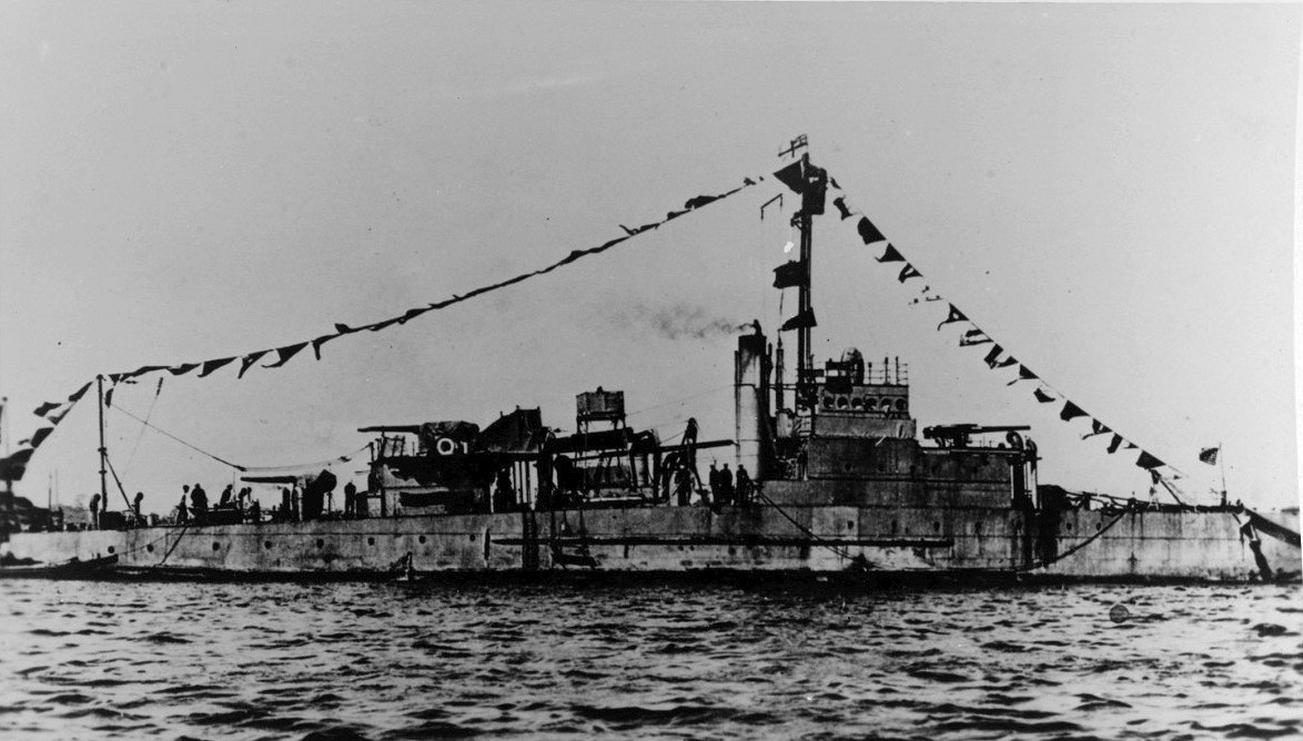 143k | 30 October 1918 Undergoing her final fitting out before joining the fleet. Note the stern mounted depth charge racks, among the earliest applied to a naval combatant. National Archives photo |