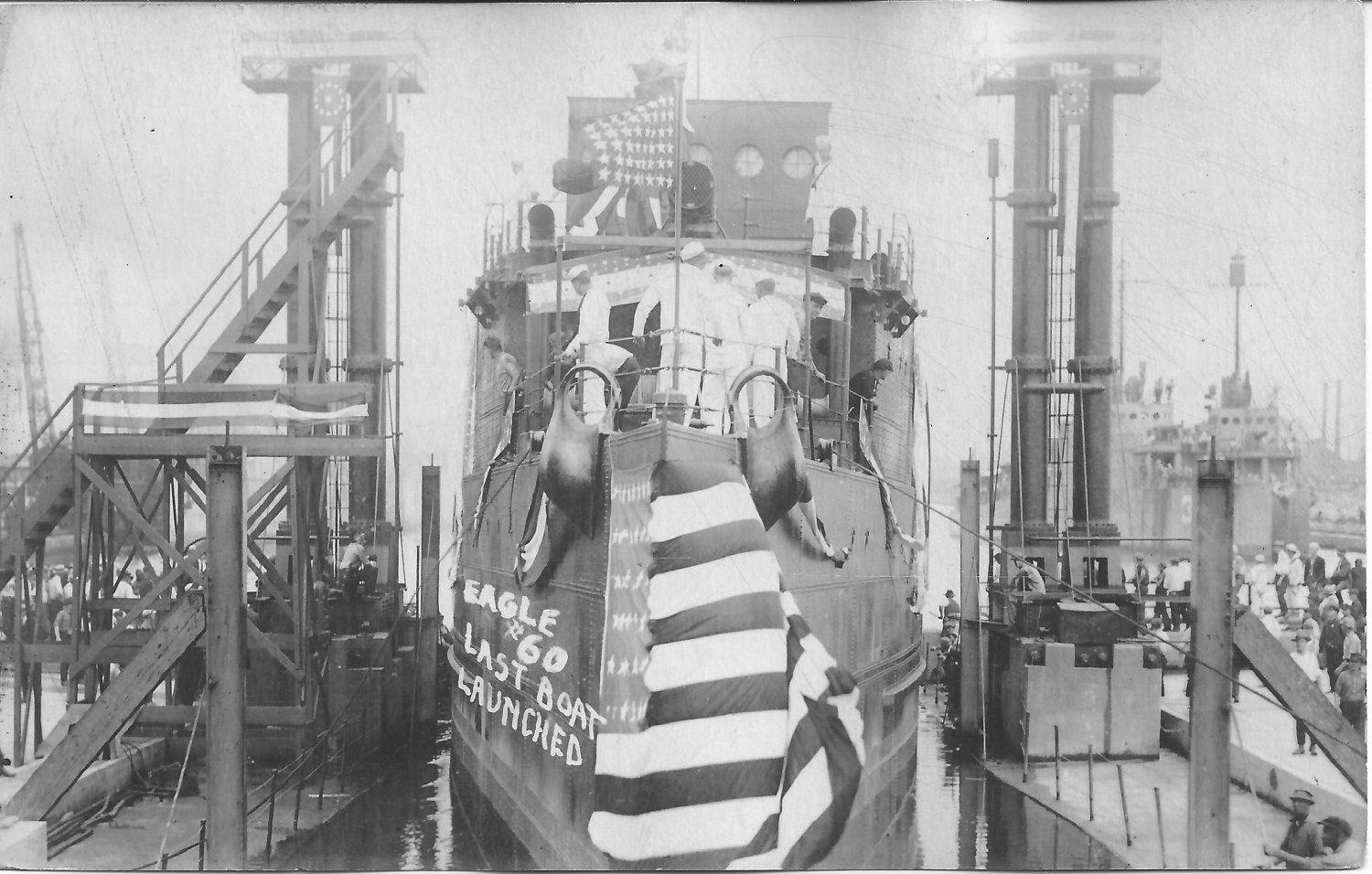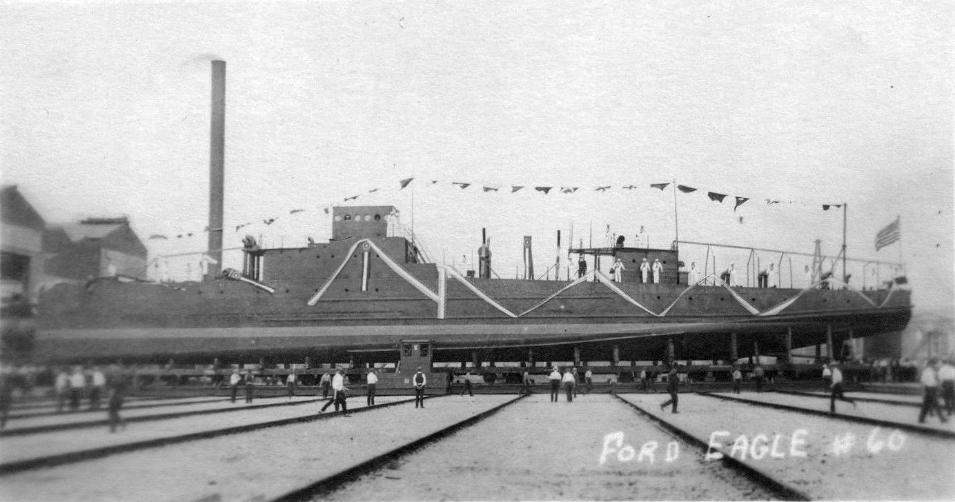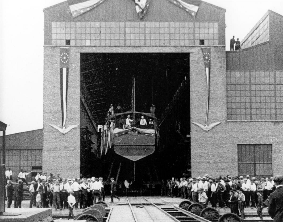 123k | Original photo: c. 1919 Detroit, MI Dressed overall with flags prior to launching Replacement photo: Dressed in flags being launched at the Ford Motor Company, Detroit, Michigan, 13 August 1919 Naval History and Heritage Command photo NH 70995 |