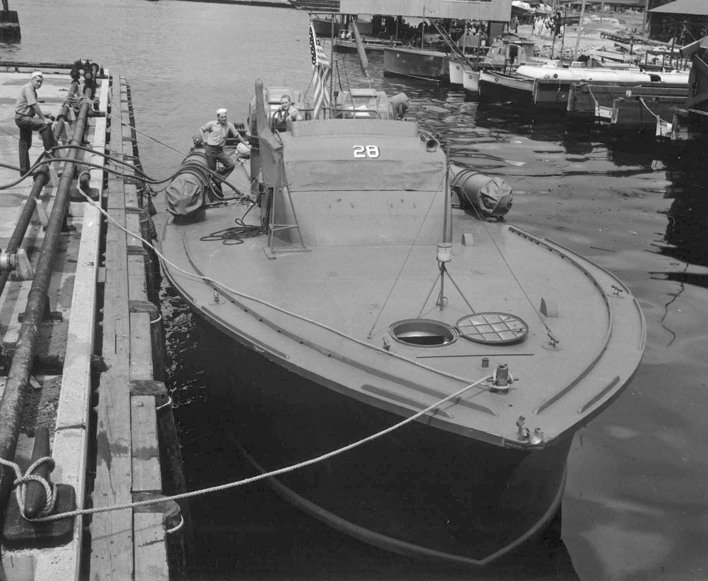USS Hornet (CV-8) arrives at Pearl Harbor after the Doolittle Raid on Japan, 30 April 1942. PT-28 and PT-29 are speeding by in the foreground National Archives photo |