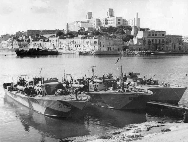 95k | HM MTB-313, HM MTB-260, ex-PT-11 and HM MTB-77 moored at Valletta, Malta Imperial War Museum photo 14545 by LT F. G. Roper, Royal Navy Official photographer |