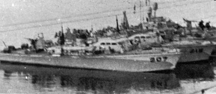 69k | HM MTB 307 (ex-PT-49) and HM MTB 313 moored alongside several Vospers, apparently at Alexandria, Egypt. At some point after being merged with the 10th MTB Flotilla, the surviving 77 ft. MTBs of the 15th MTB Flotilla were repainted in the Light Standard Scheme F Photo H. Tong. CFVA |