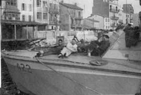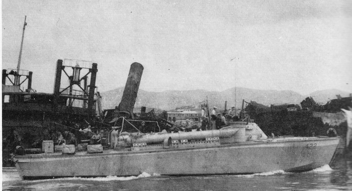 PT-92 208k HM MTB-422 (ex-USS PT-92) passing wrecks at Livorno, Italy. She is armed with a 40 mm Bofors aft, a 20 mm oerlikon amidships, two twin .5" cal. Browning mgs abreast the bridge, and 2-21" torpedo tubes