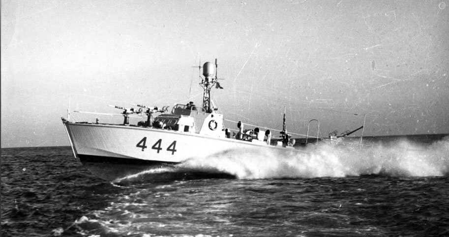 MS 453 (ex-USS PT-125) and MS 444 with an unidentified "MS" boat and an "Ape" class corvette underway