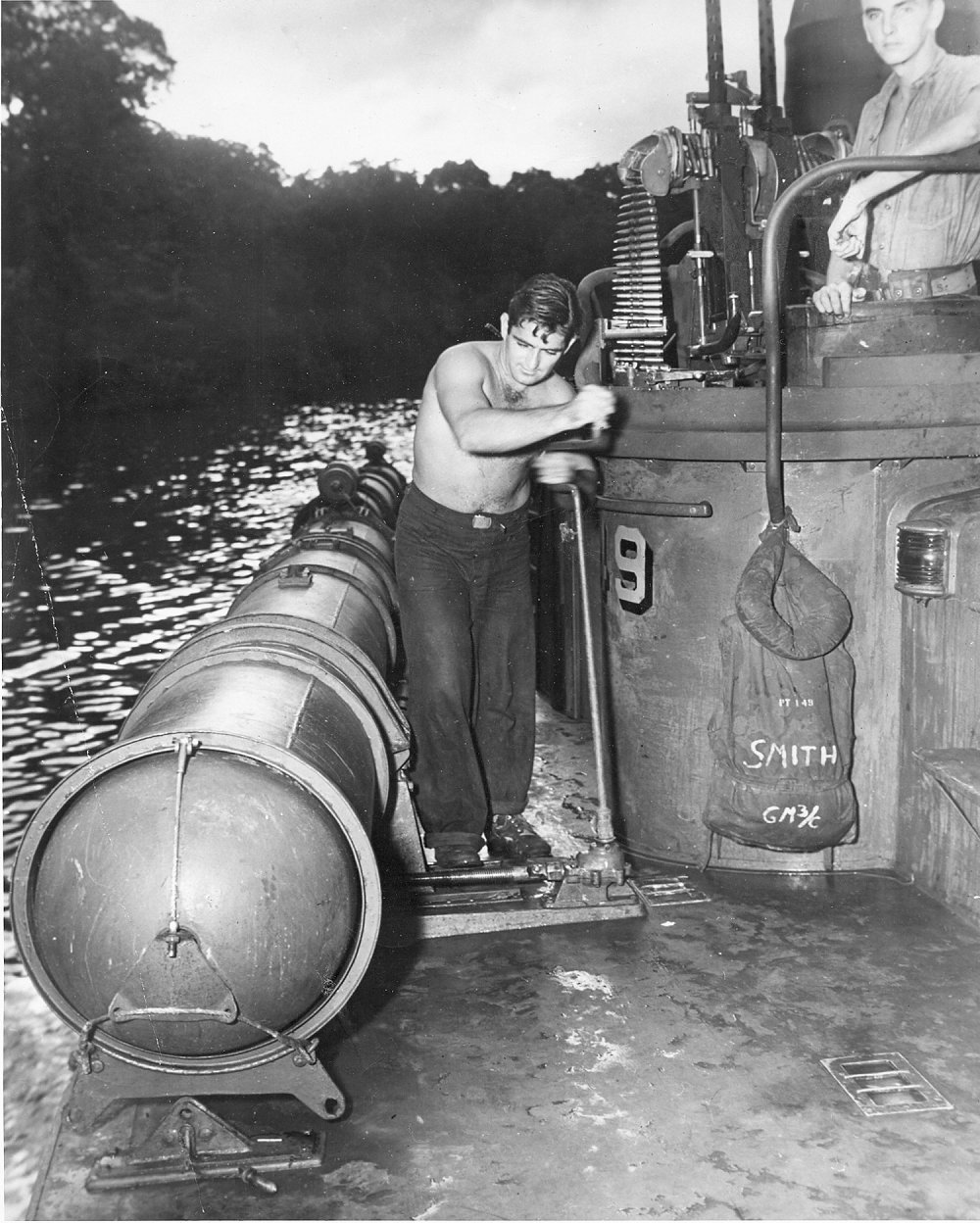 13 April 1944 Charles L. Smith, GM3/c standing in the starboard .50 cal. mount watching a Torpedoman making adjustments to the forward tube Photo from the Electric Boat Co., ELCO Division, Bayonne, NJ |