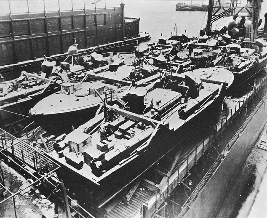 in New York in December 1942 for shipment to Panama. PT-155 is on the far left with PT-152 in the center National Archives photo 80-G-184393 from "At Close Quarters PT Boats in the United States Navy" by Captain Robert J. Bulkley, Jr., USNR (Retired) |