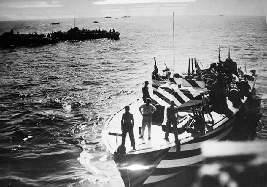 On August 23 all of the remaining boats were moved from the Baie de Briande to St. Maxime, in the Gulf of St. Tropez so that the PT's could start close inshore patrols on the eastern flank of the assault area to guard against attacks by two new and alarming types of enemy vessels: explosive boats and human torpedoes.