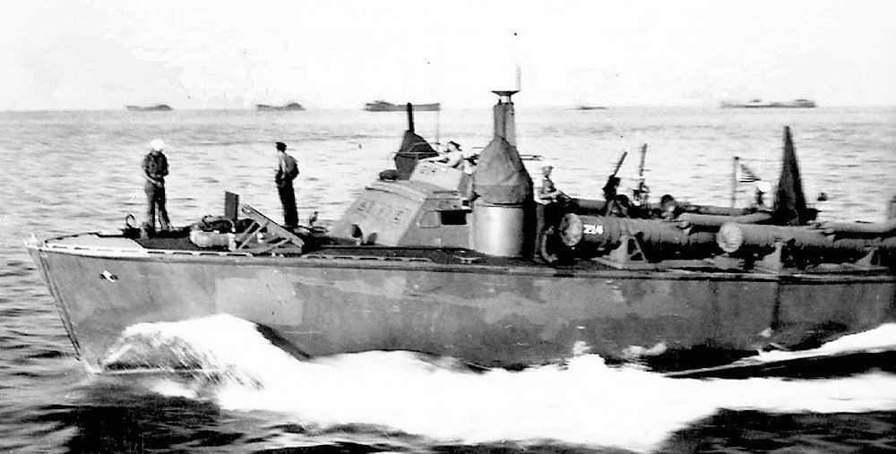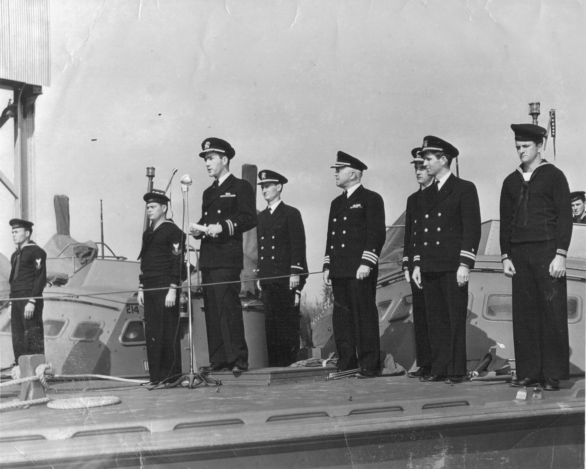 26 February 1943 New Orleans, LA MTBRon 16 commissioning ceremony on the fore deck of PT-215. PT-214 is in the background |