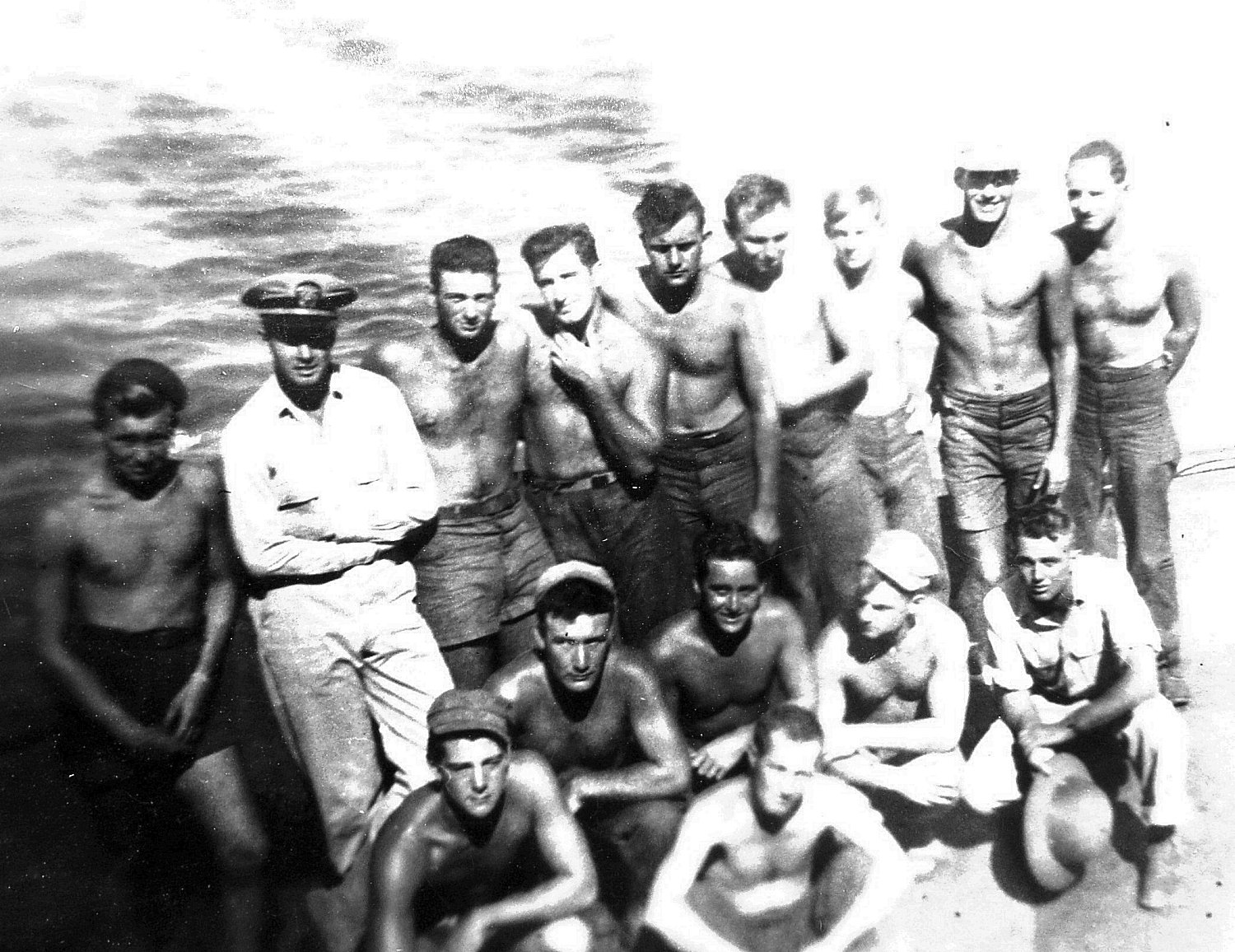 Back row: Mazingo, LT Cunningham, Billis, Taylor, Van Kuelsen, Schmidt, Hoffman, O. B. Williams and Sterns Middle row: Sherbon, Peoples, Cunningham, Downey and LT Byrne C. Fernelius, USN Sitting: Stevenson From the collection of O. B. Williams |