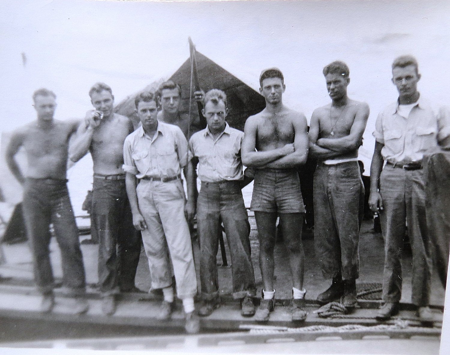 Back row: Richards, Stephenson, Downey, Billis and Williams Front row: Hoffman (with bananas), LT Byrne C. Fernelius, USN and LT Post From the collection of O. B. Williams |