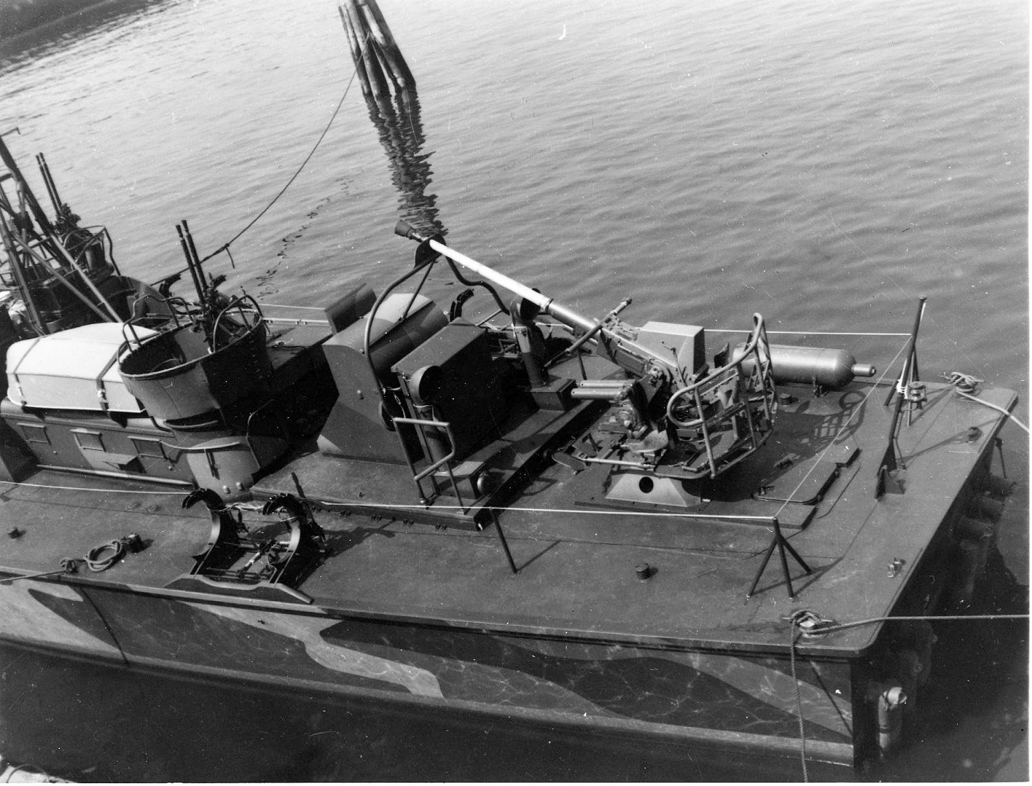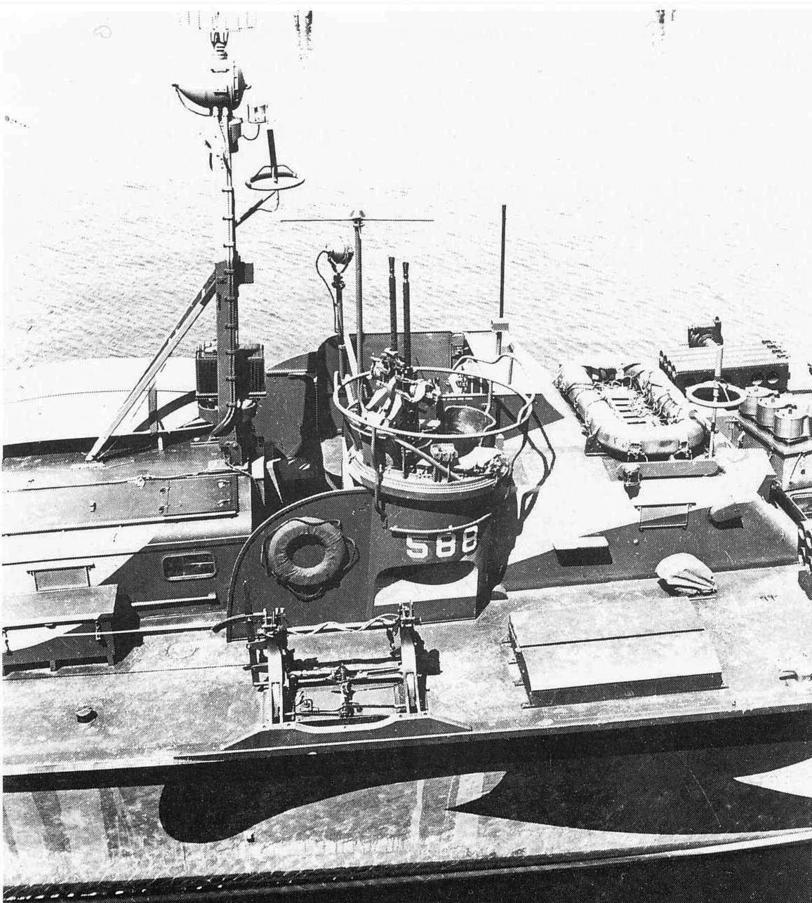 357k | c. April 1945 Close-up of the forward turret, launching rack and rocket magazine U.S. Navy photo from "Allied Coastal Forces of World War II: Vol. II" by John Lambert and Al Ross |
