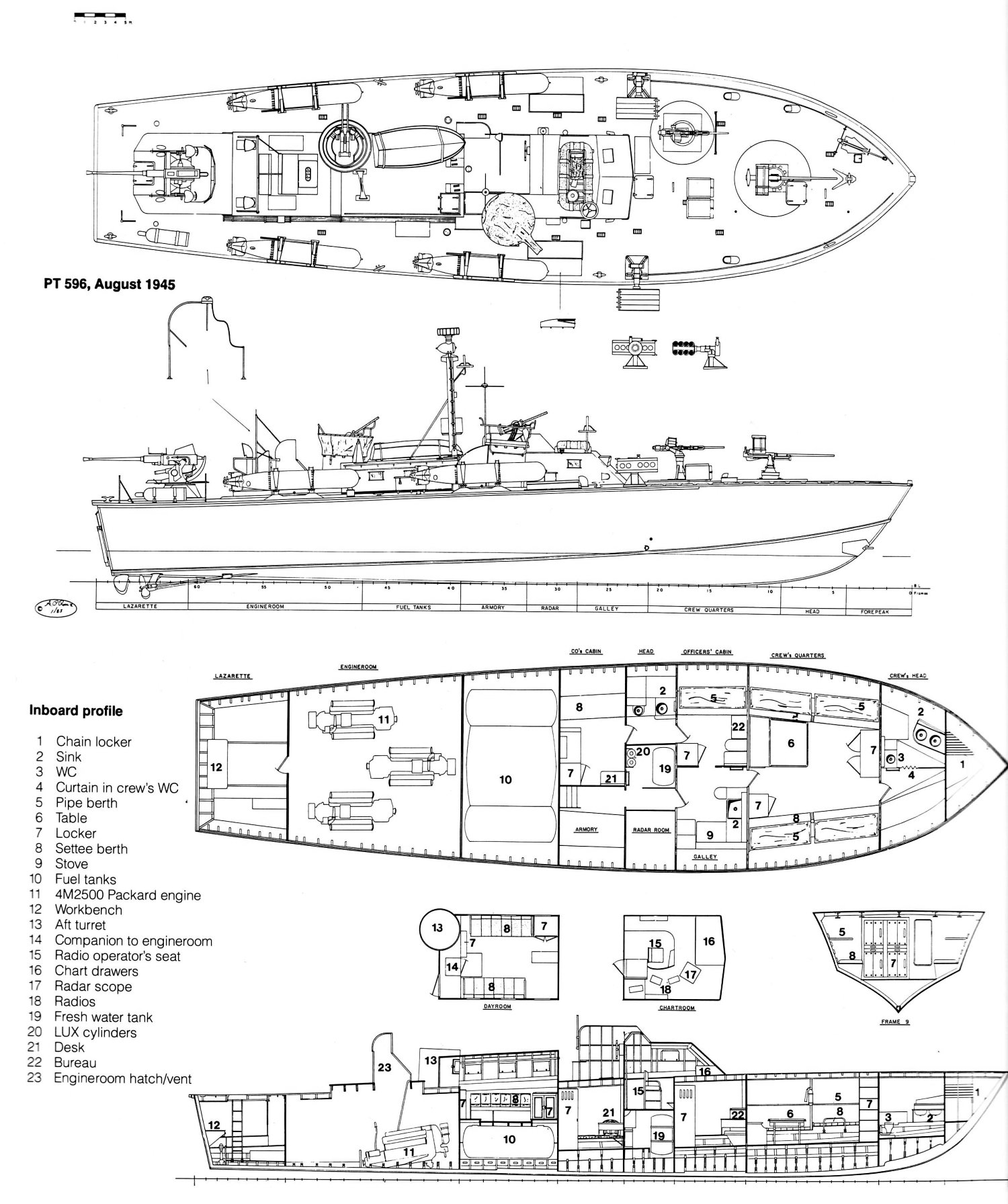 399k | c. August 1945 Side elevation and deck plans from "Allied Coastal Forces of World War II: Vol. II" by John Lambert and Al Ross |