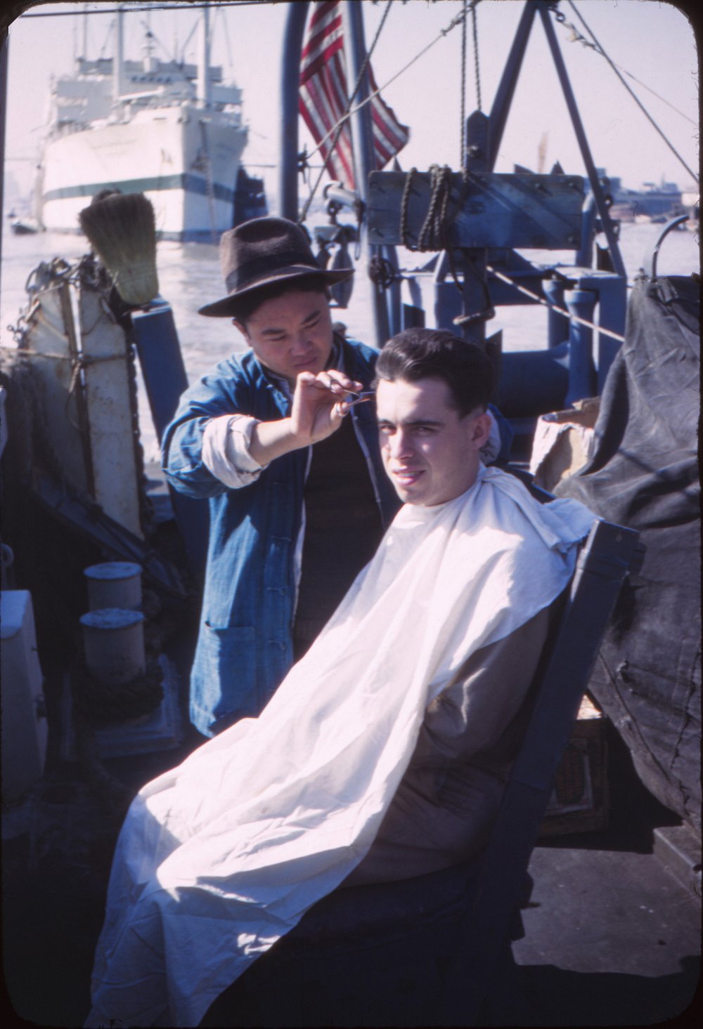 c. 1946 Shanghai, China George R. Herbert, Jr. getting a trim with an unidentified Hospital Ship in the background From the collection of George R. Herbert, Jr. |