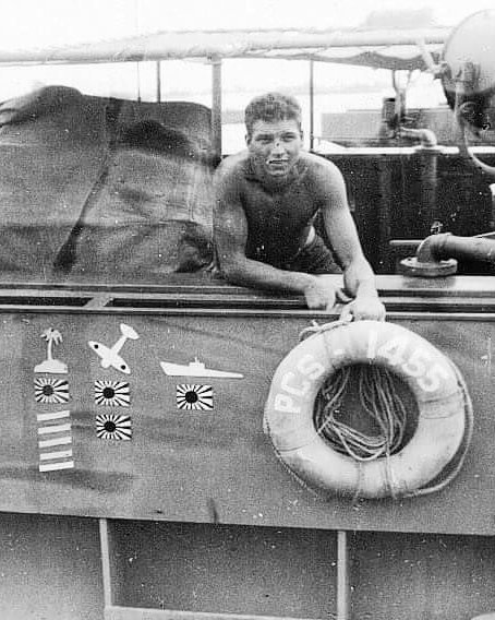 c. April 1945 Underway from Okinawa to Ulithi. Flag at half mast after the death of President Roosevelt From the collection of Cecil Gale Chamberlin, EM1/c |