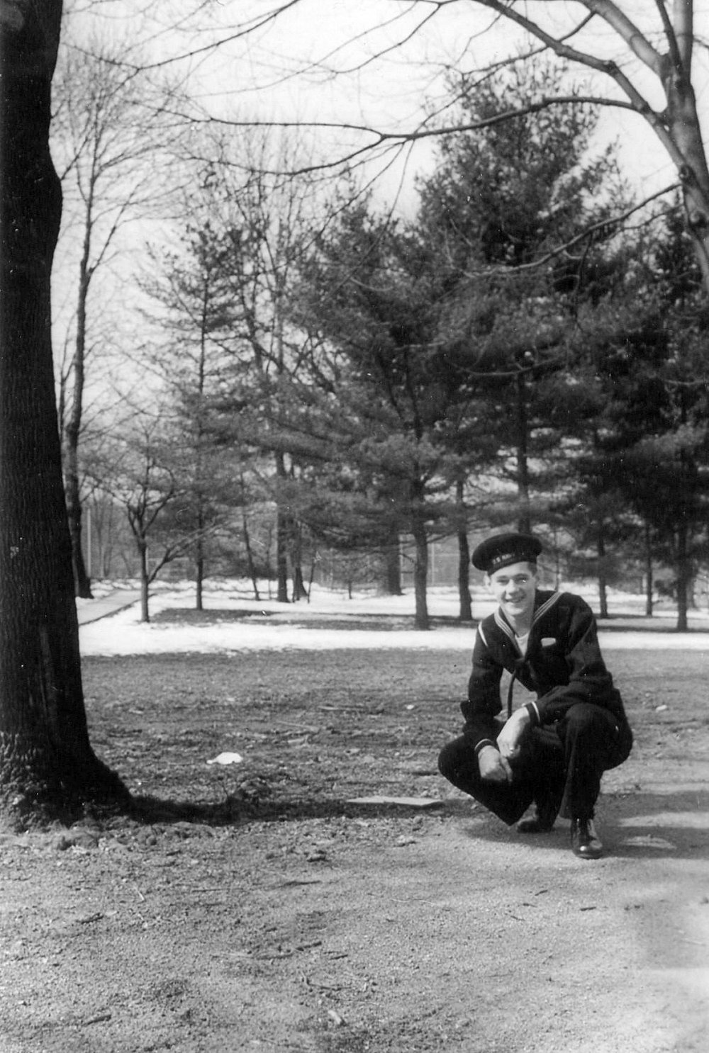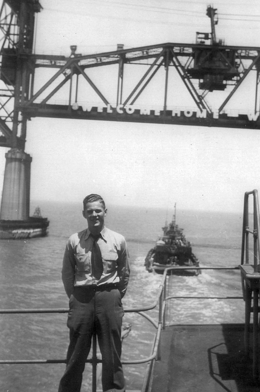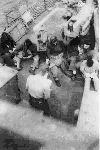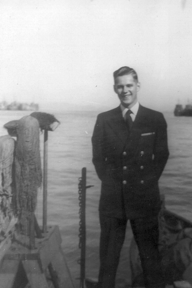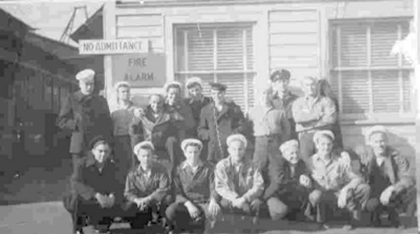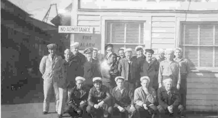 5. Precommissioning crew. This was taken in front of Western Boat, Tacoma, Washington. Front row, left to right: Ackley Y2/c, Lemon MM2/c, Steiner S1/c, Buckley Phar 1/c, Lickness MM 2/c, Johnson S2/c, and Norman SC1/c. Back row: Unknown, Reynolds RM2/c, Leonard GM3/c, Walker V. S1/c, Warden GM3/c, Louis R.V. QM 2/c, Chief Hamilton, and Alexander EM2/c.